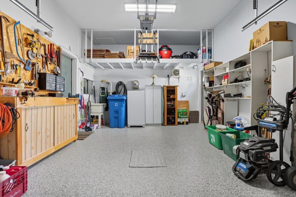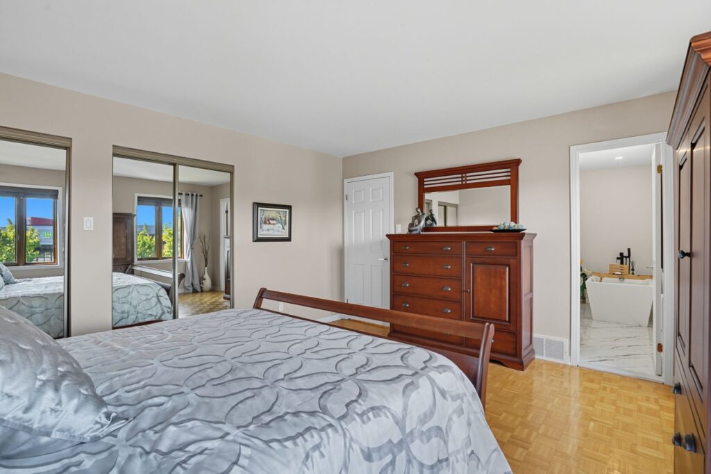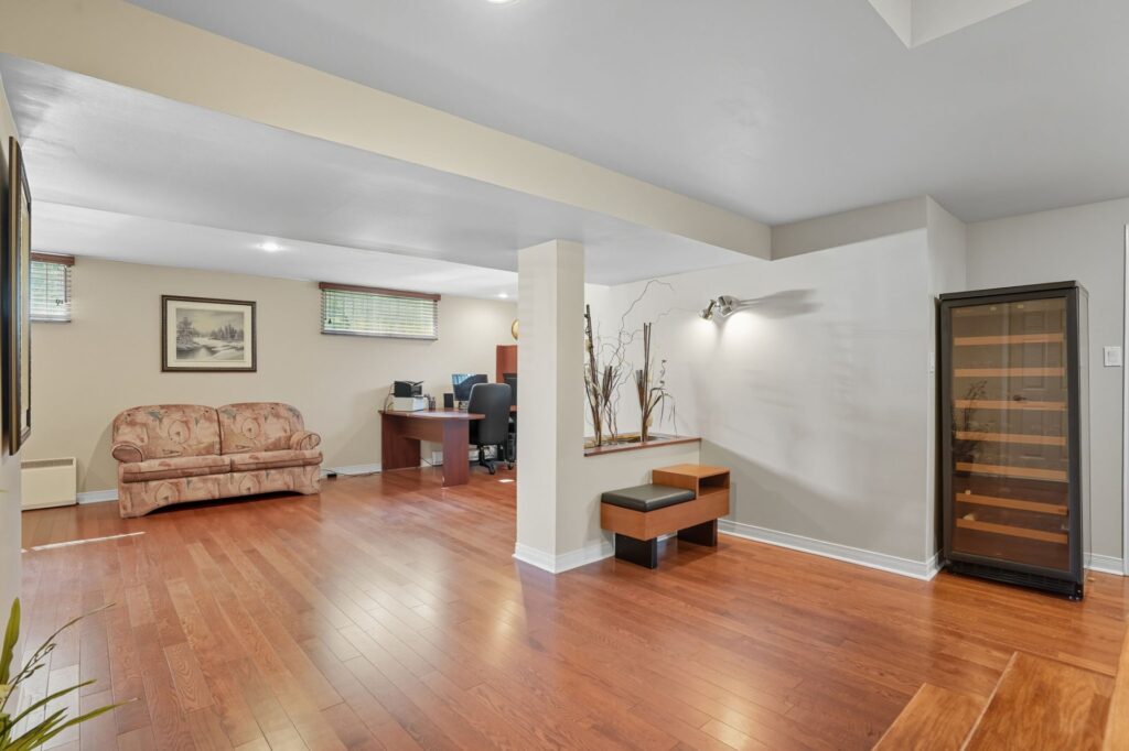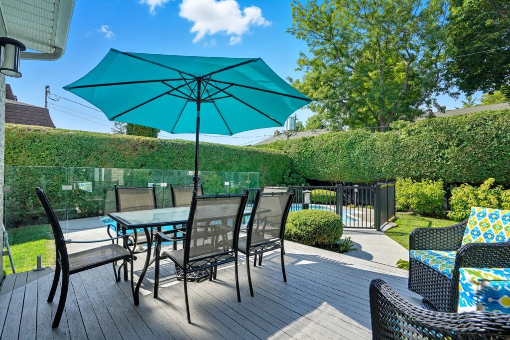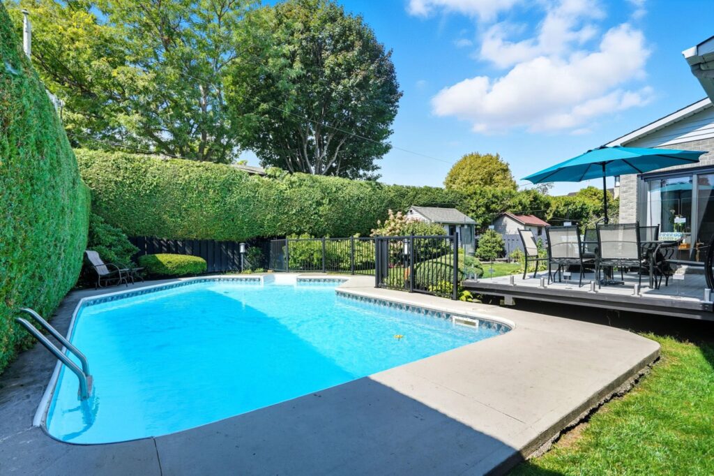 Outdoors, you’ll be charmed by the large, private backyard, enhanced with mature cedar hedges. The wooden balcony is covered with fibercement and features an elegant glass railing overlooking the inground pool. The epoxy-finished garage adds a practical and upscale touch.
