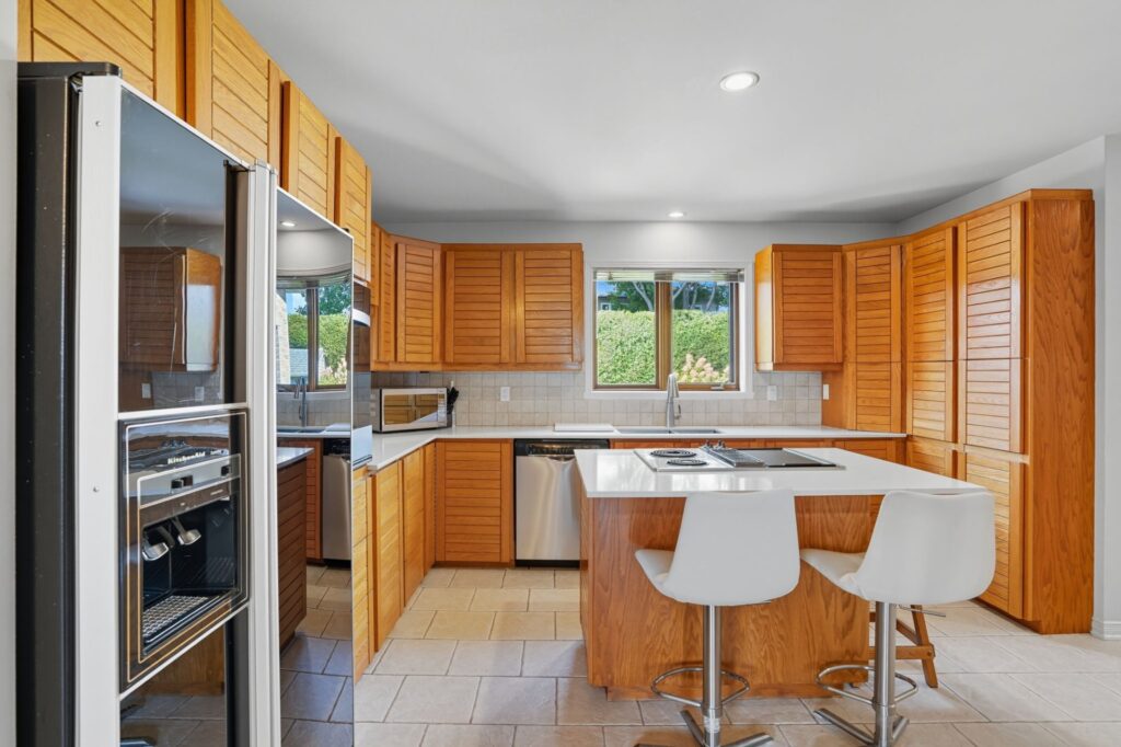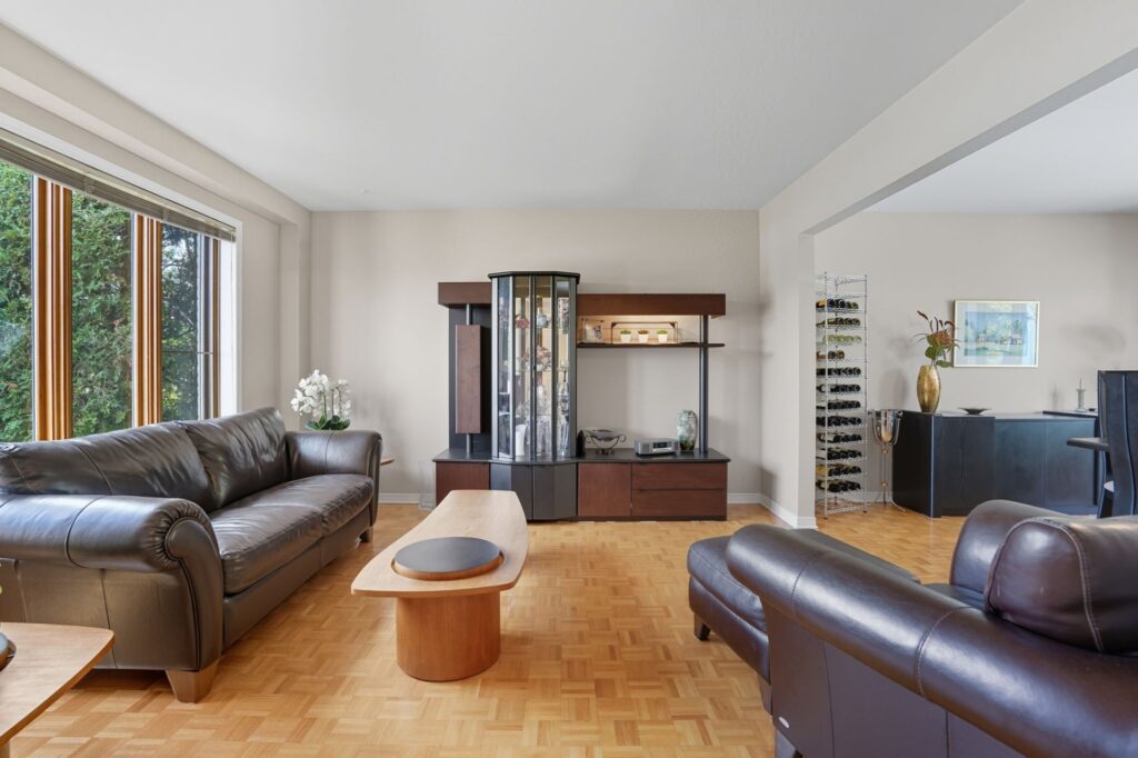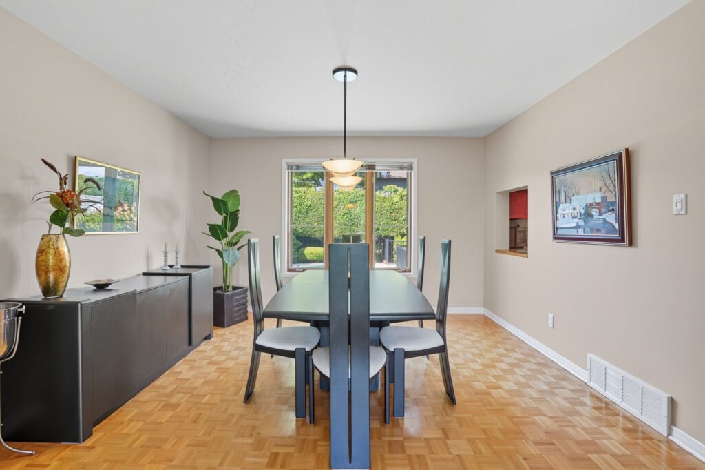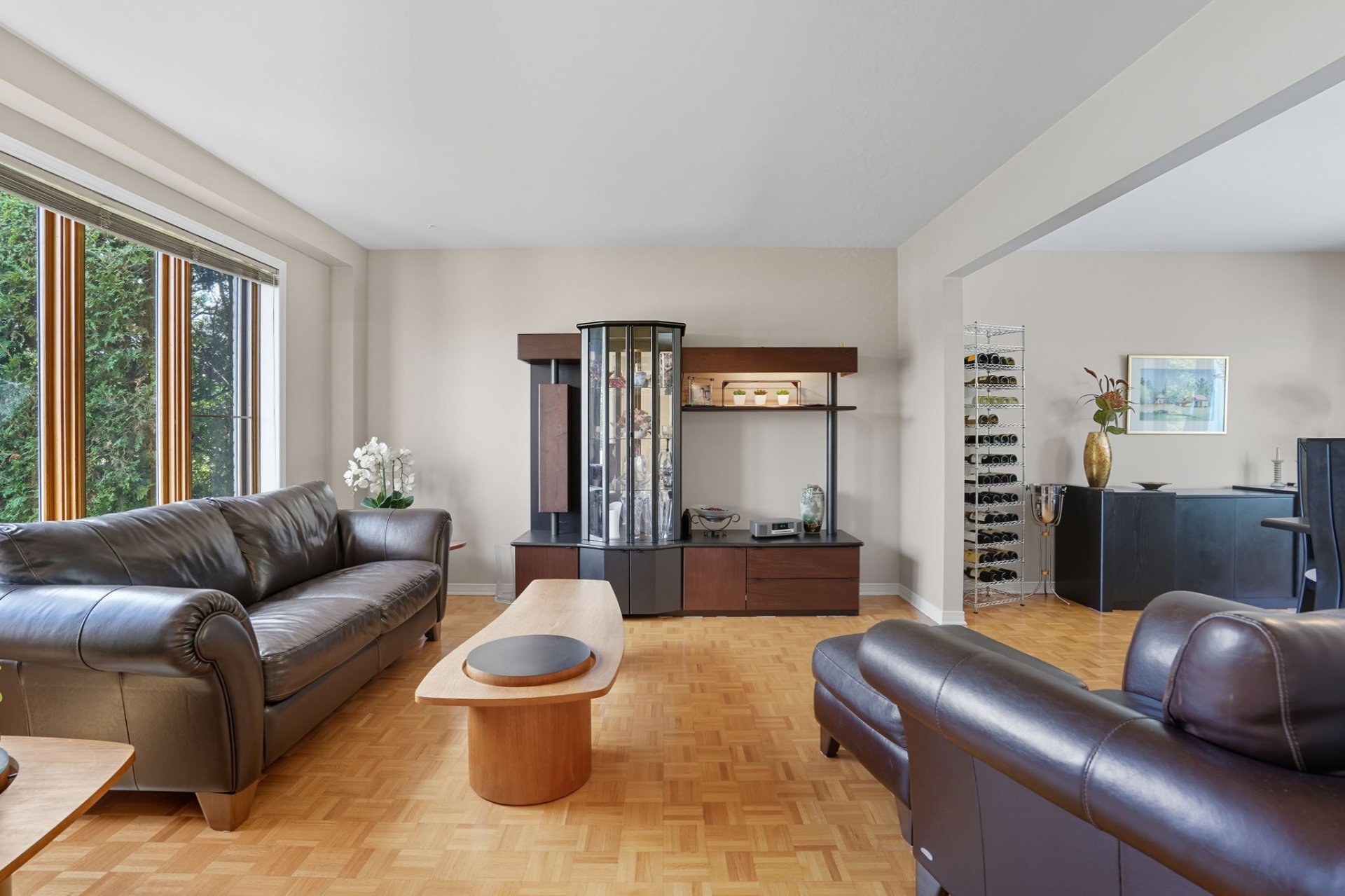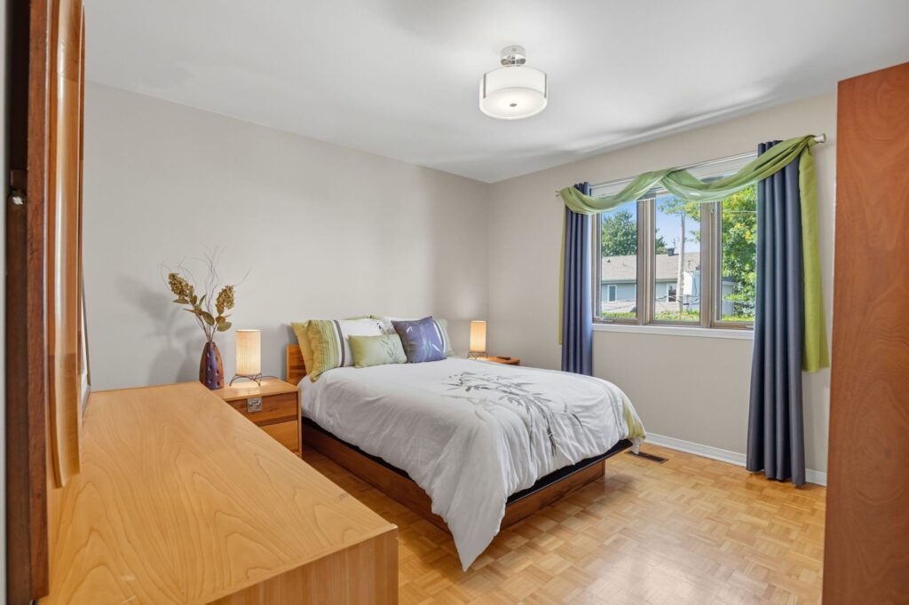 Outdoors, you’ll be charmed by the large, private backyard, enhanced with mature cedar hedges. The wooden balcony is covered with fibercement and features an elegant glass railing overlooking the inground pool. The epoxy-finished garage adds a practical and upscale touch.