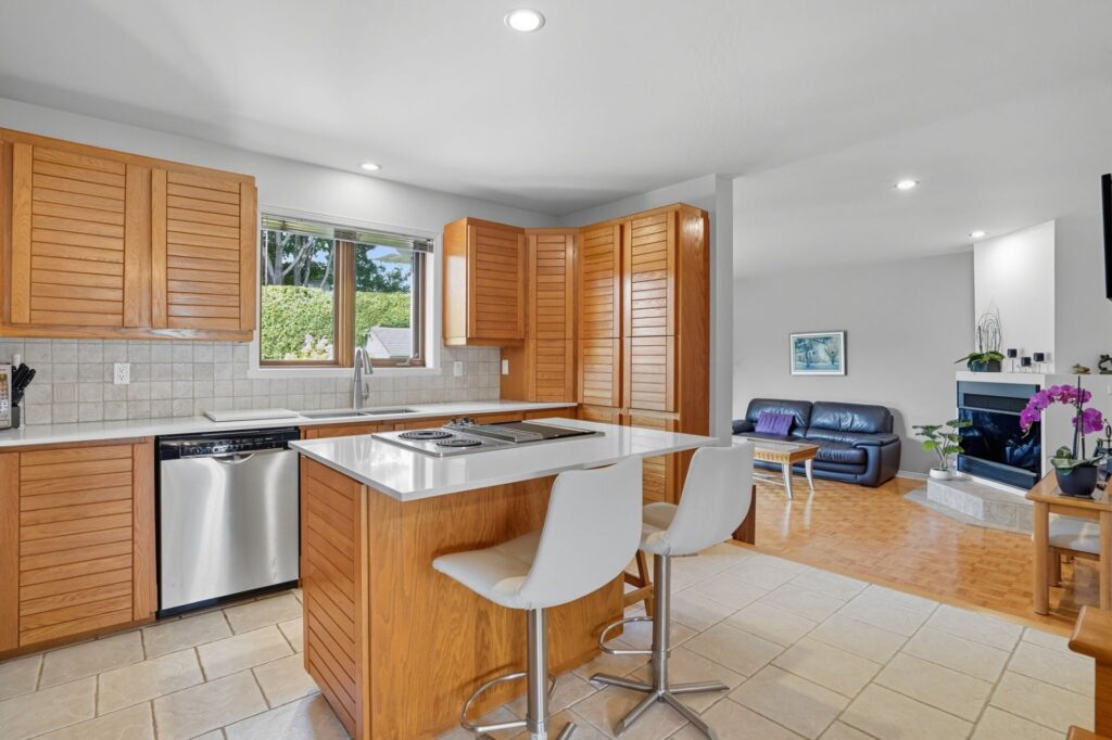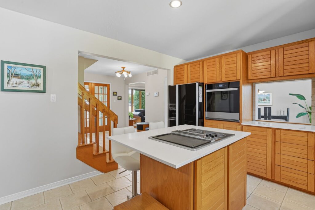 Inside, the main floor features a spacious kitchen with a central island and quartz countertops. The dining room opens to a welcoming living room, while an impressive family room filled with natural light offers the perfect space for entertaining, complete with a wood fireplace. A renovated powder room with integrated laundry completes this level.