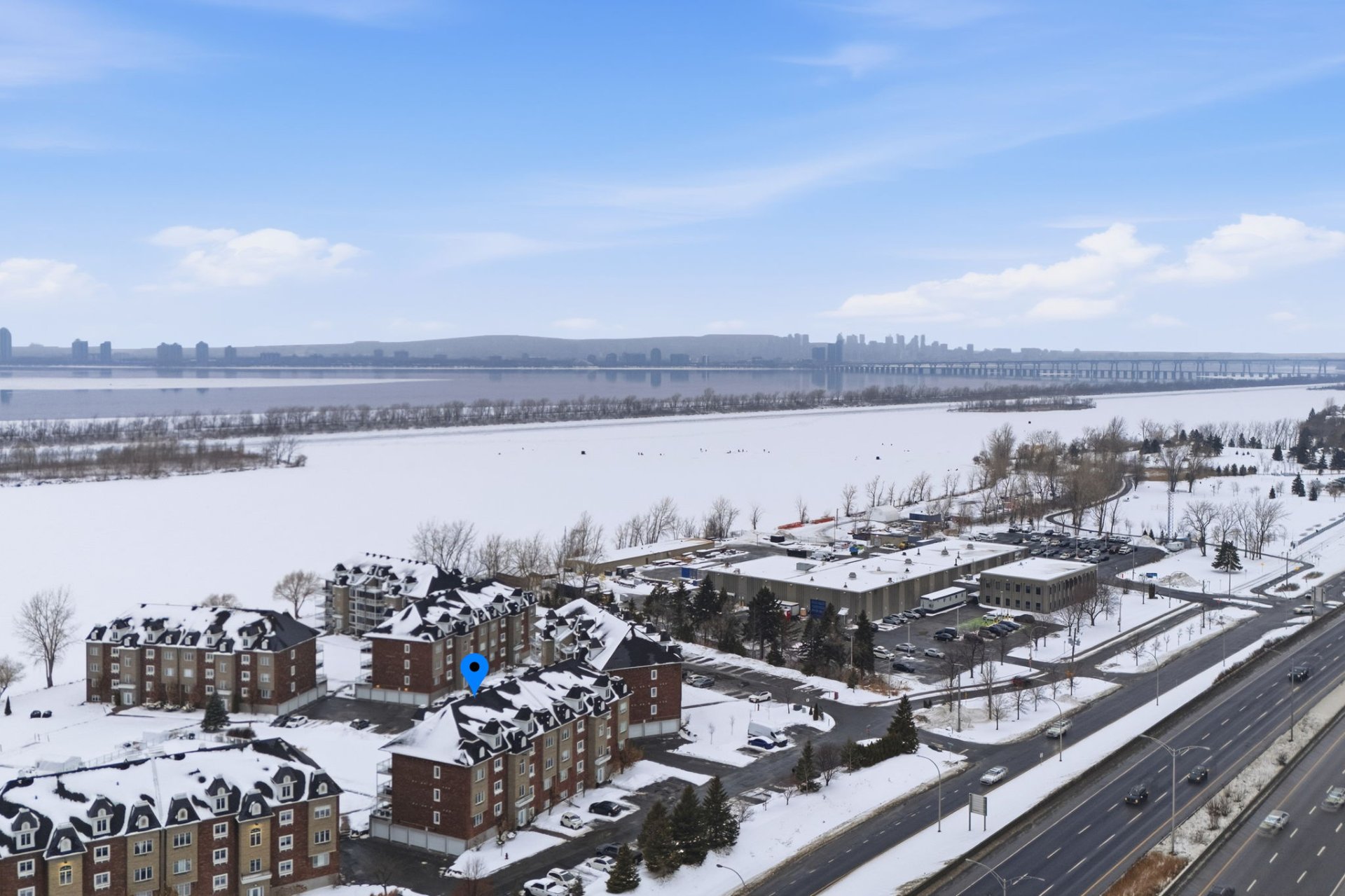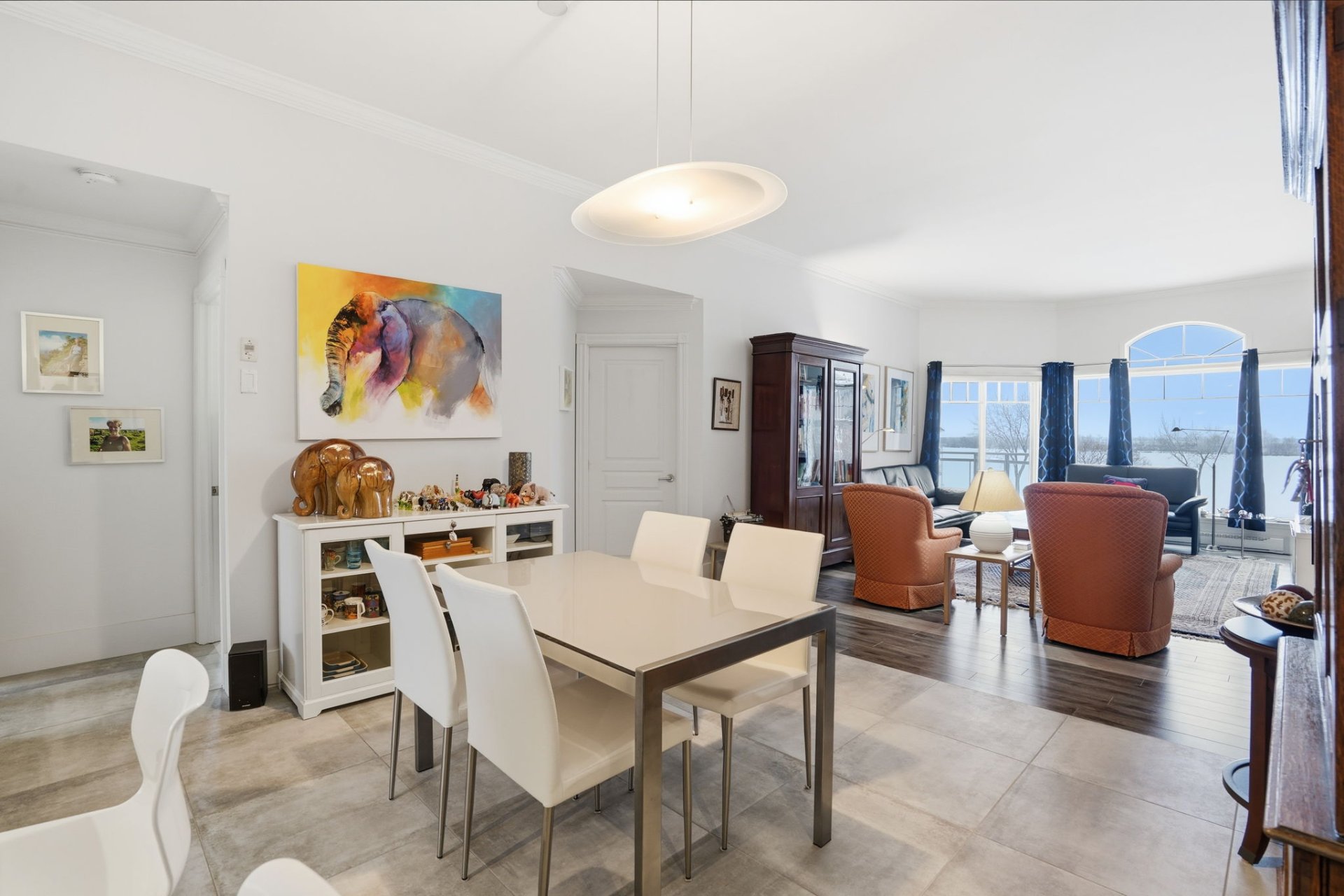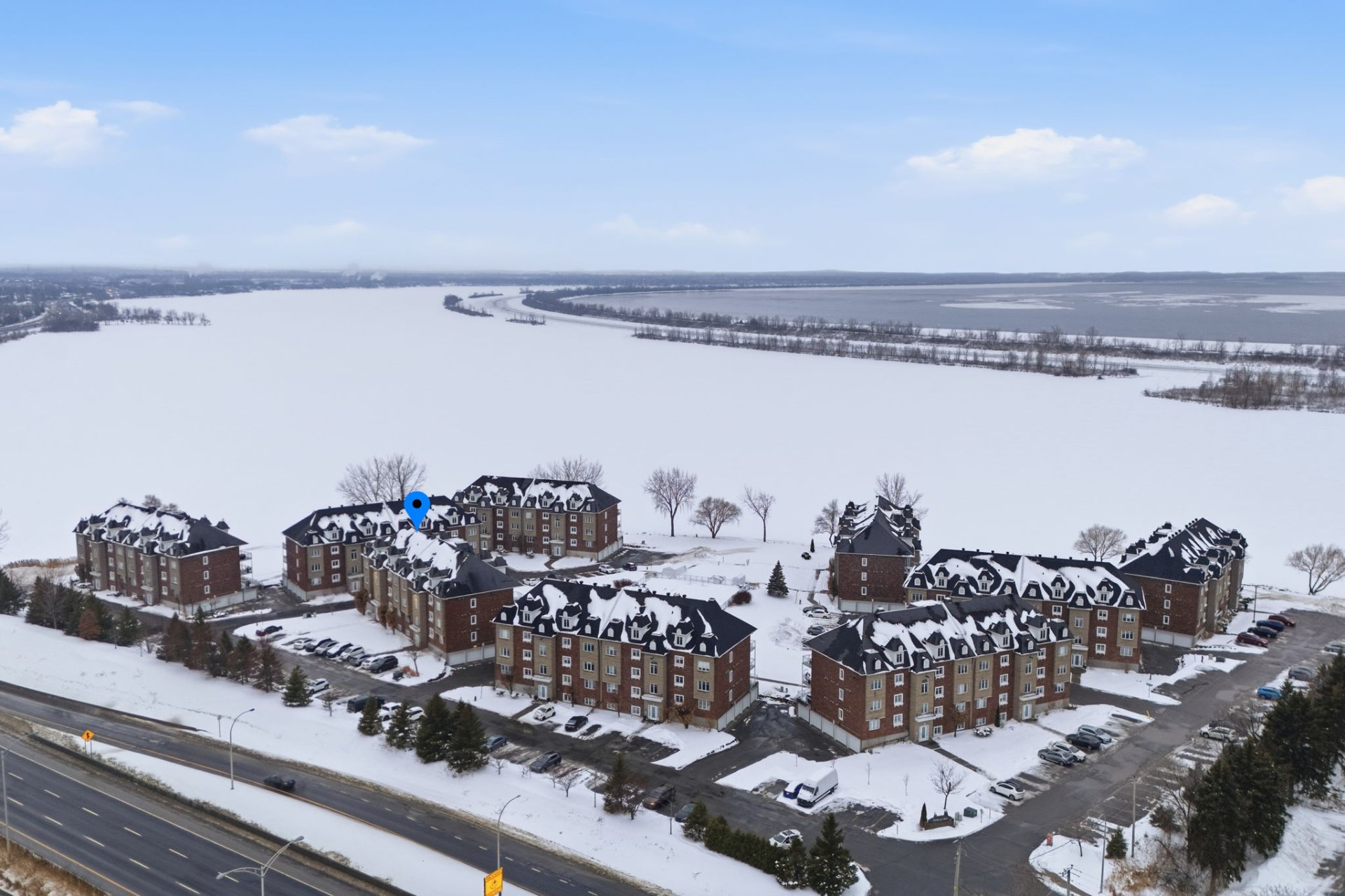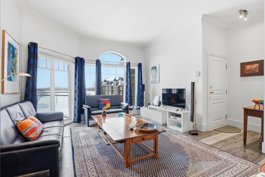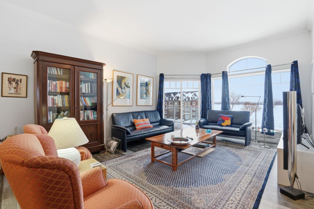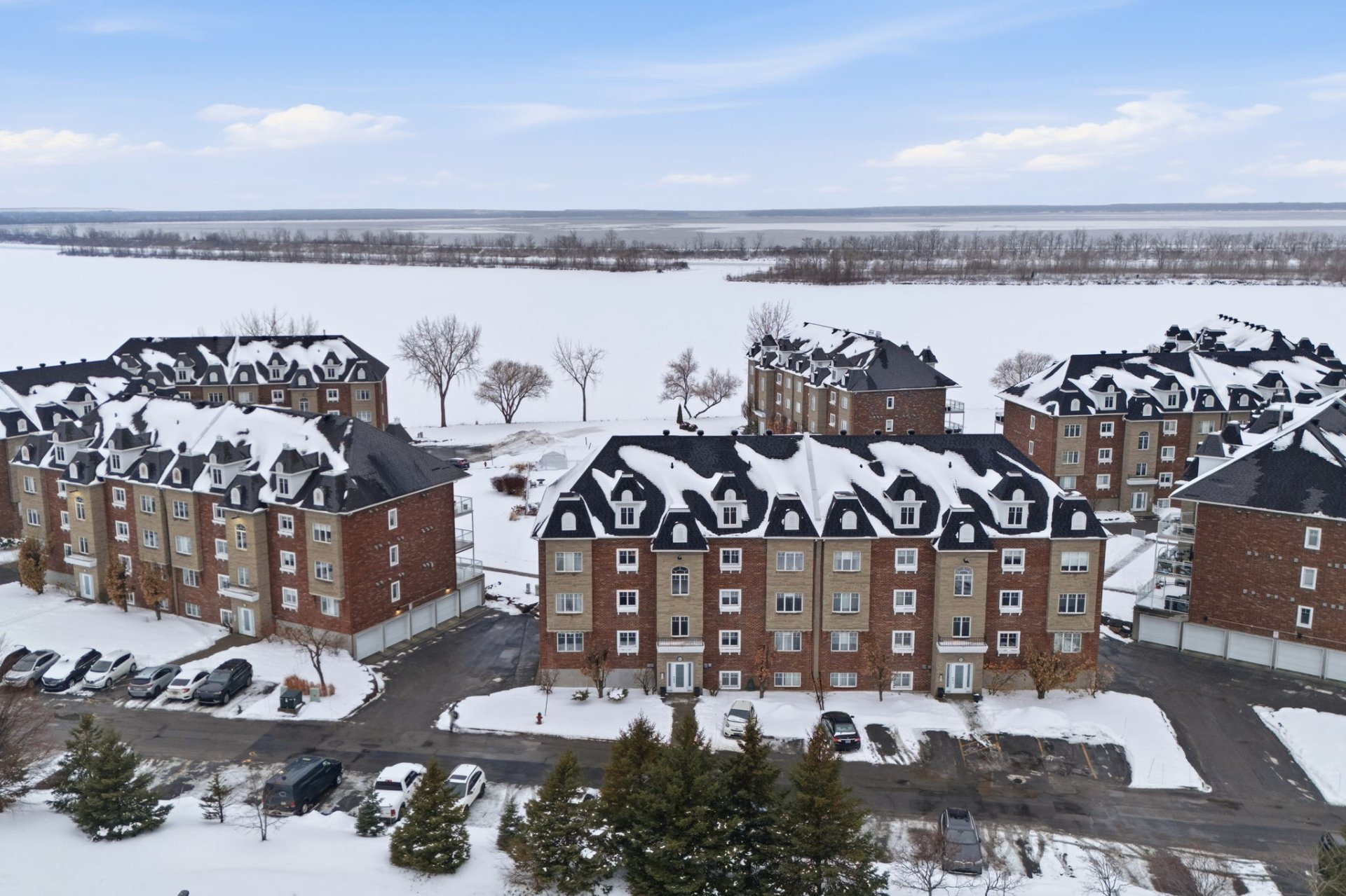 Beautiful 3rd-floor condo offering a spectacular view of the St. Lawrence River. This bright unit features two generously sized bedrooms, including a primary bedroom with walk-in closet, as well as a renovated bathroom. Renovated white and elegant kitchen with granite countertops, and heated floors in both the kitchen and bathroom for optimal comfort. Three parking spaces included, one in the garage with adjacent storage and another located under the pool. In-ground pool overlooking the river, set in a peaceful environment close to all services. Enjoy a breathtaking sunset over the river every evening.