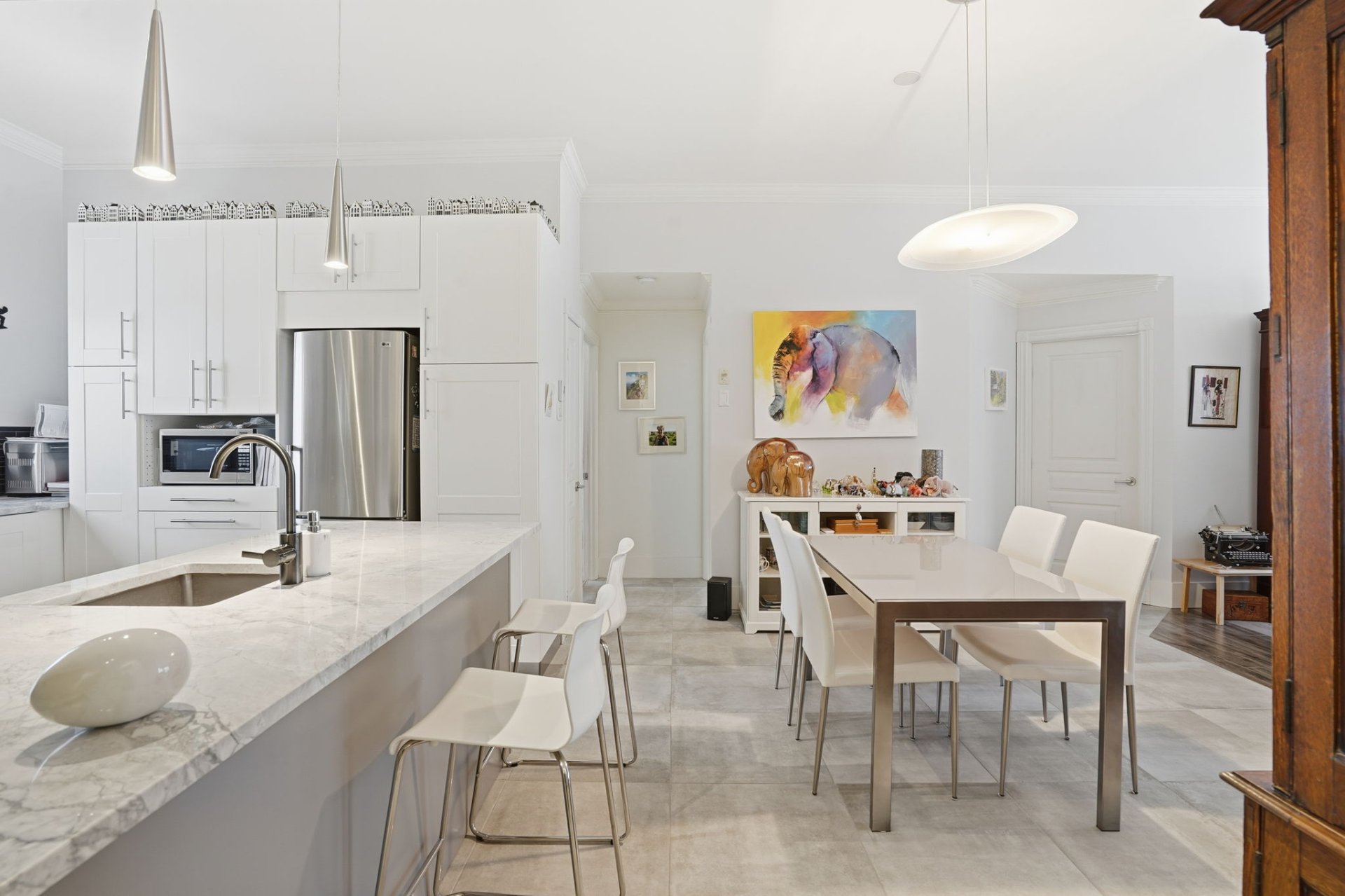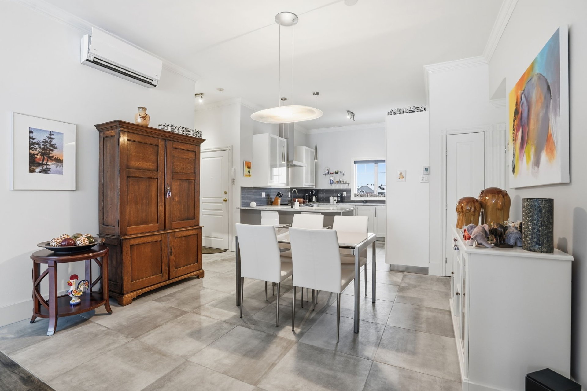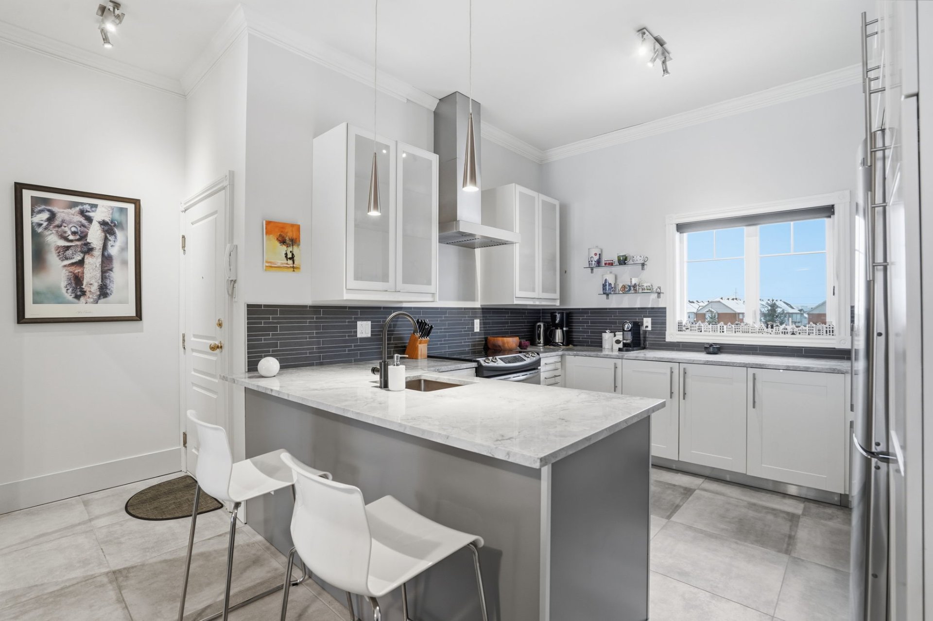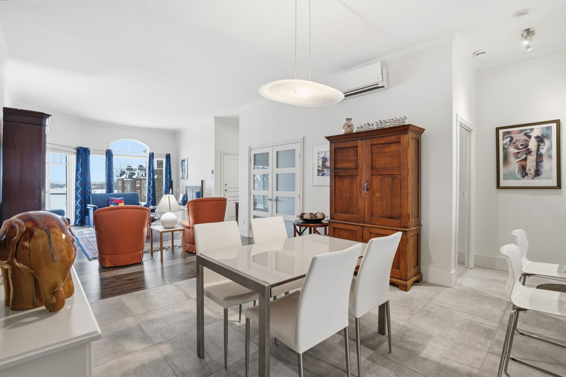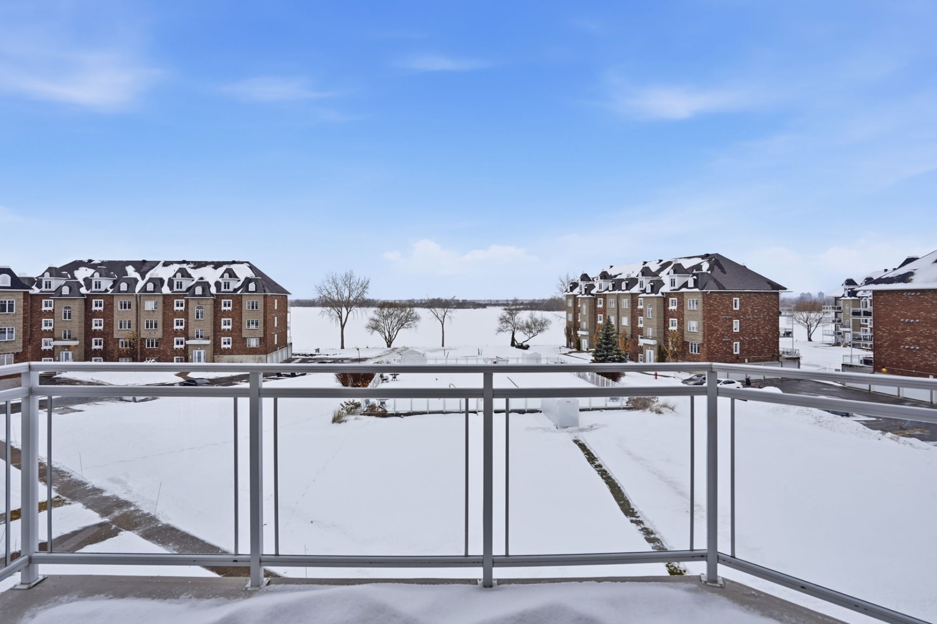 Beautiful 3rd-floor condo offering a spectacular view of the St. Lawrence River. This bright unit features two generously sized bedrooms, including a primary bedroom with walk-in closet, as well as a renovated bathroom. Renovated white and elegant kitchen with granite countertops, and heated floors in both the kitchen and bathroom for optimal comfort. Three parking spaces included, one in the garage with adjacent storage and another located under the pool. In-ground pool overlooking the river, set in a peaceful environment close to all services. Enjoy a breathtaking sunset over the river every evening.