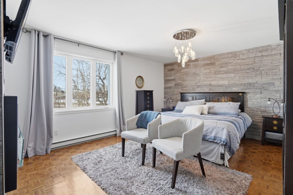 Upstairs, the sleeping area includes three well-proportioned bedrooms. The primary bedroom features an ethanol fireplace and a private ensuite bathroom renovated in 2025, creating a true personal retreat. A second full bathroom on this level was also renovated in 2025. The bedrooms are bright and well suited for a growing family.