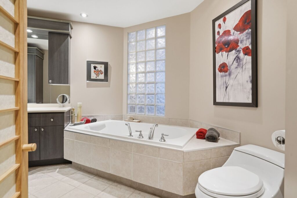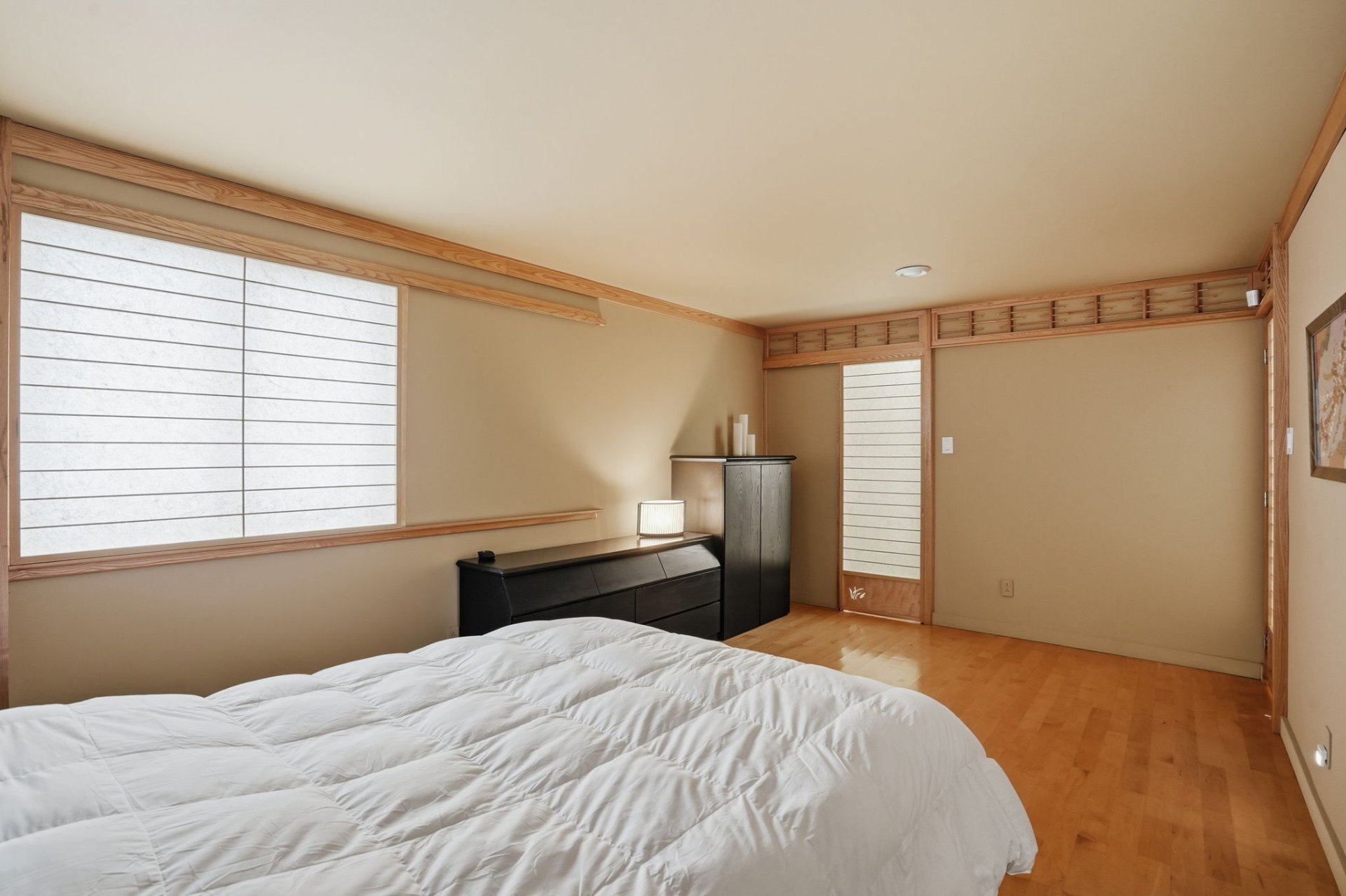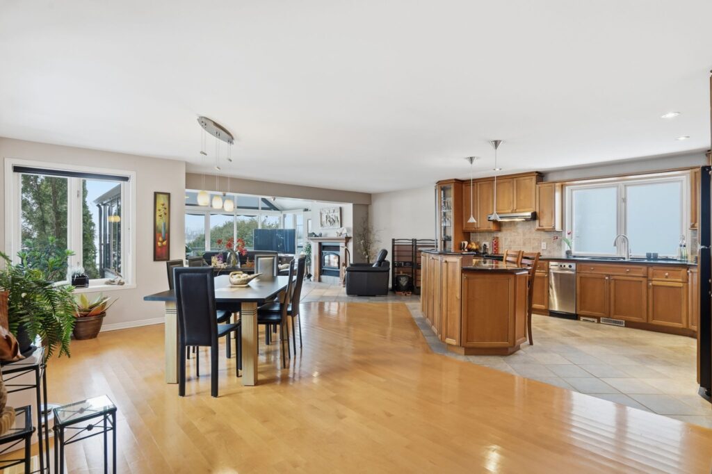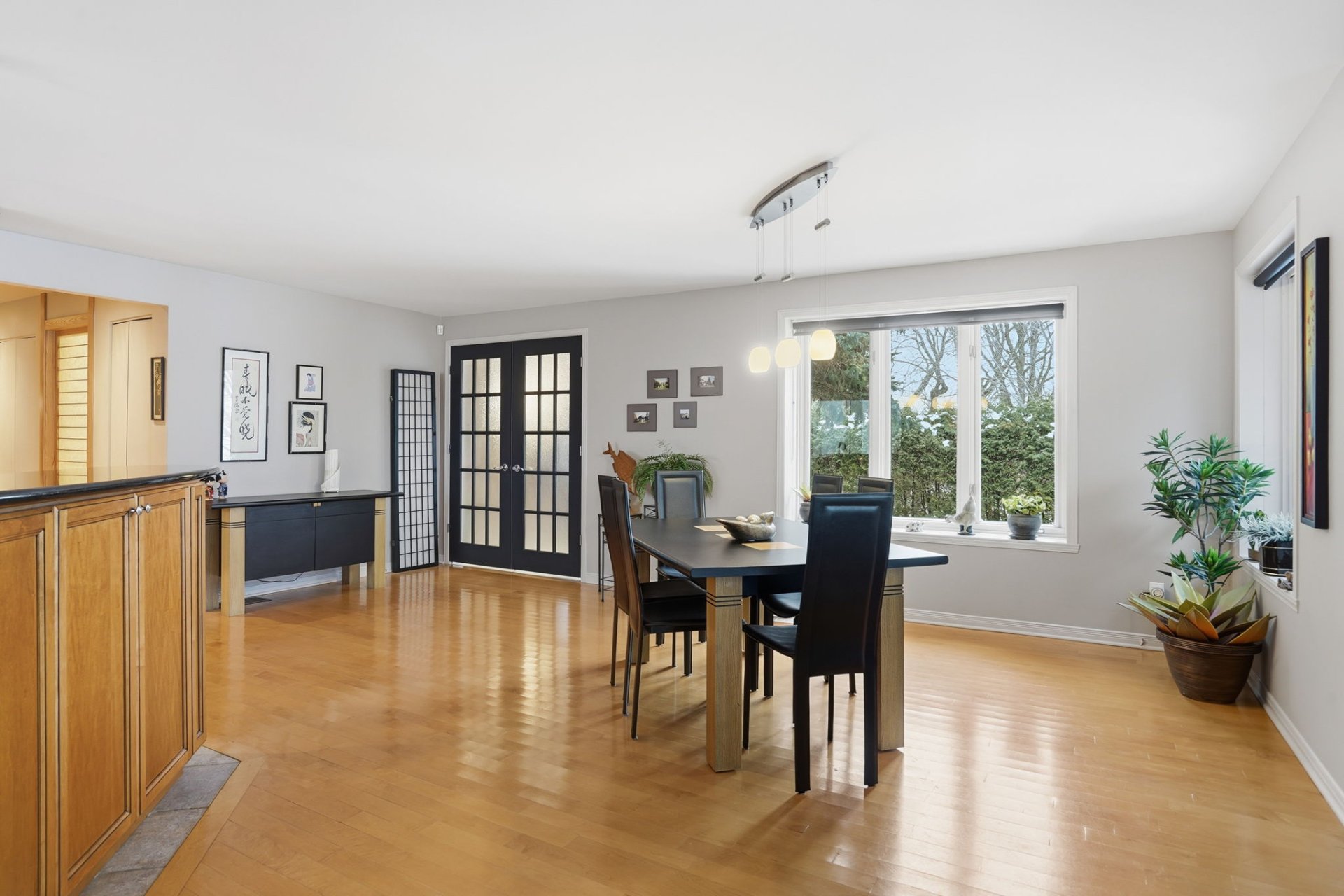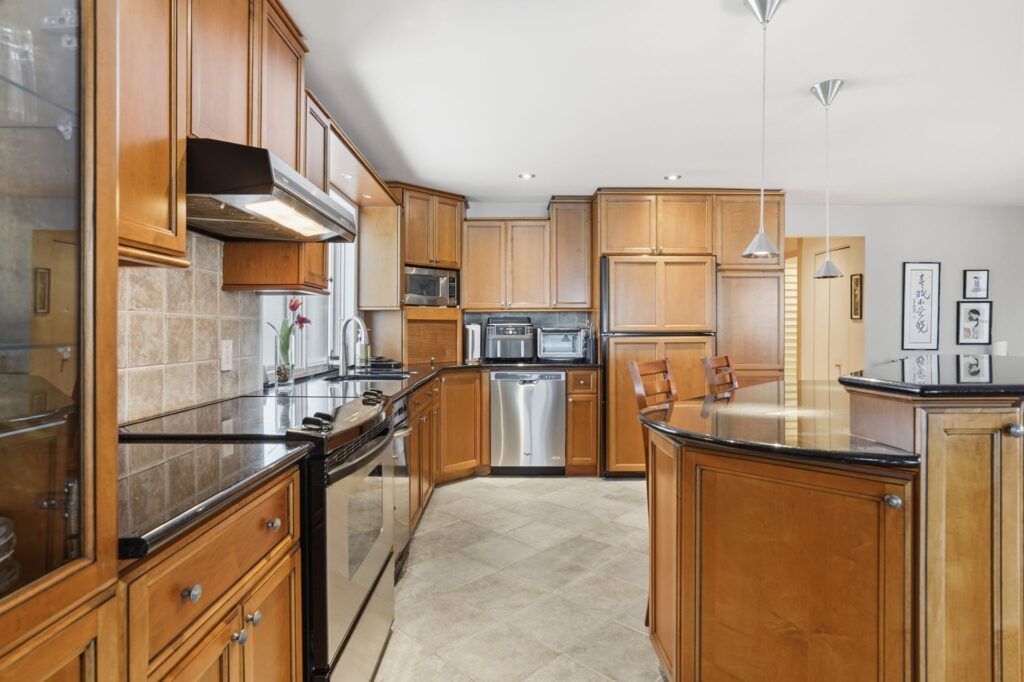 The kitchen impresses with its cherry wood cabinetry and granite countertops, combining elegance and functionality. In 2024, the installation of shoji screens, doors, and moldings inspired by Japanese design will add a distinctive and refined touch to the entire space.