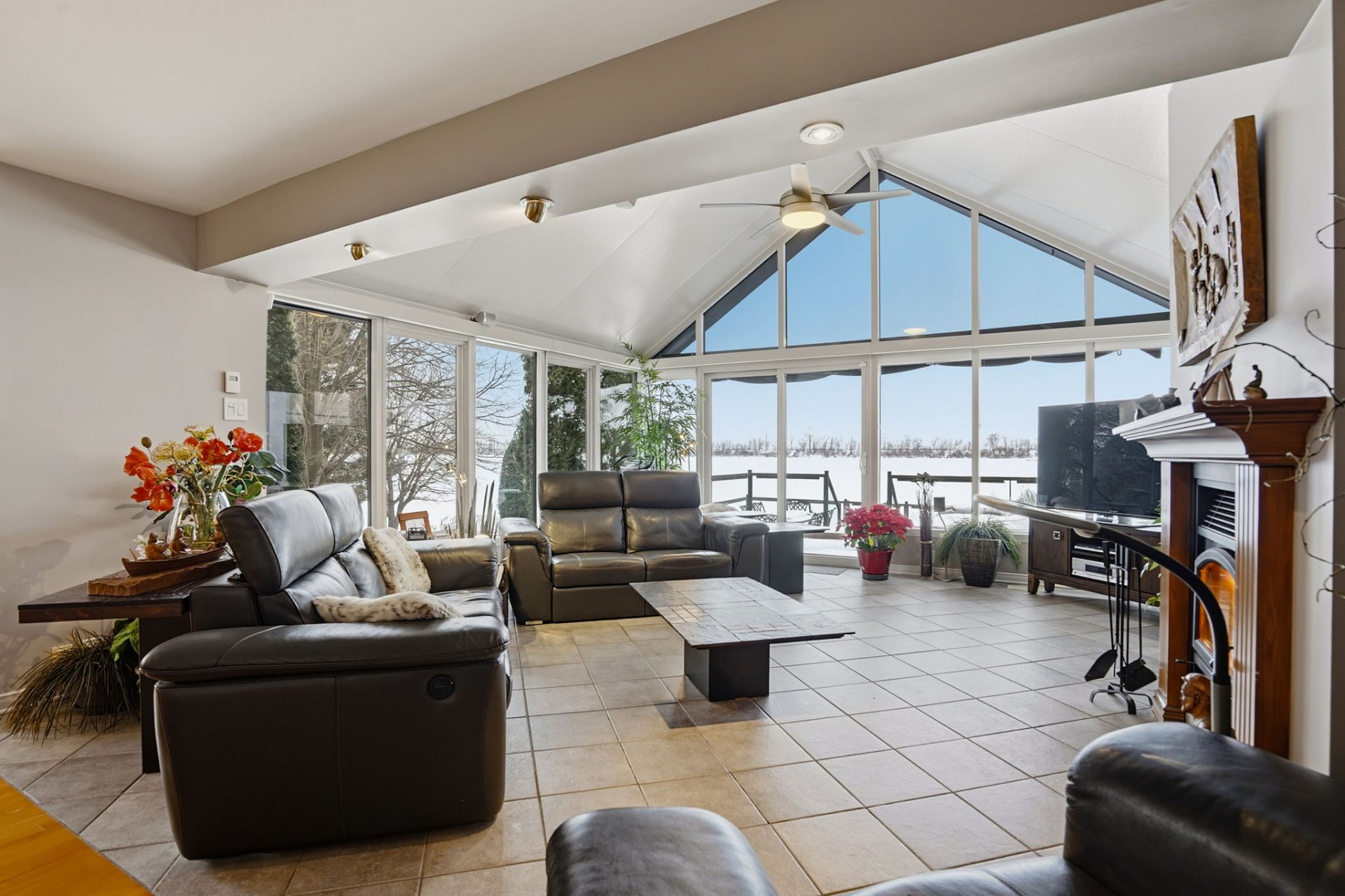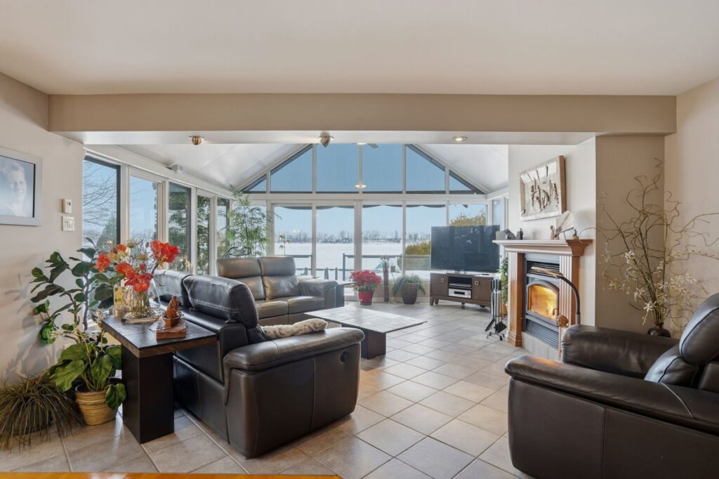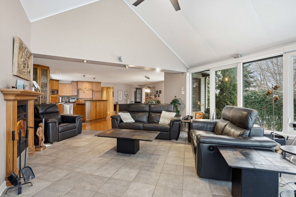 The main floor features two well-proportioned bedrooms, while a third bedroom is located in the basement, ideal for accommodating guests, setting up an office, or creating a multi-purpose space. The living room, designed with a sunroom, becomes a true haven of relaxation thanks to its heated floors, its generous windows facing the river, and its wood-burning fireplace. A balcony also allows you to fully enjoy the panoramic views and sunsets.