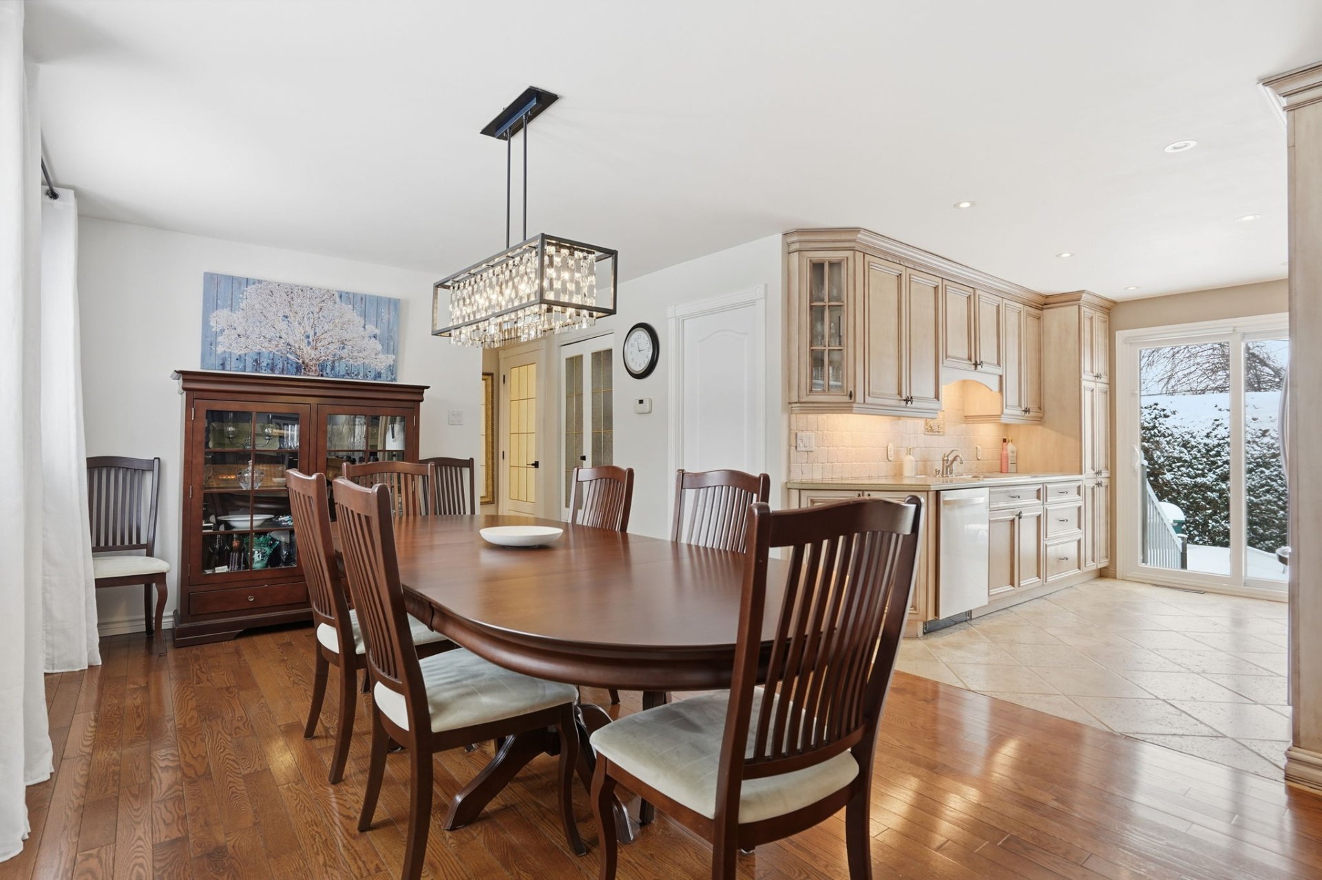 The main floor features two bedrooms and an open-concept layout combining the kitchen, a large dining area and the living room, enhanced by a wood-burning stove that creates a warm and inviting atmosphere. A full bathroom completes this level.