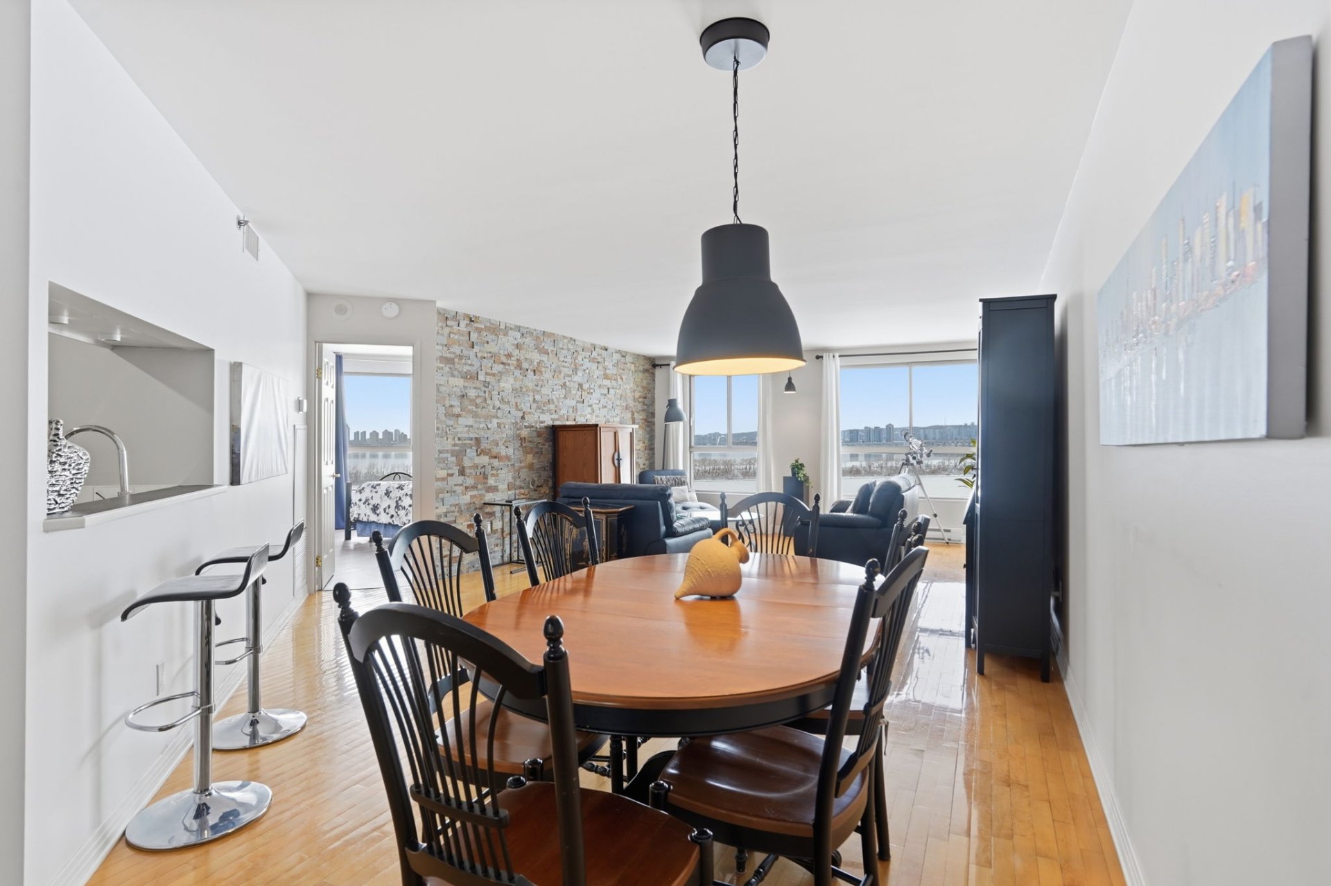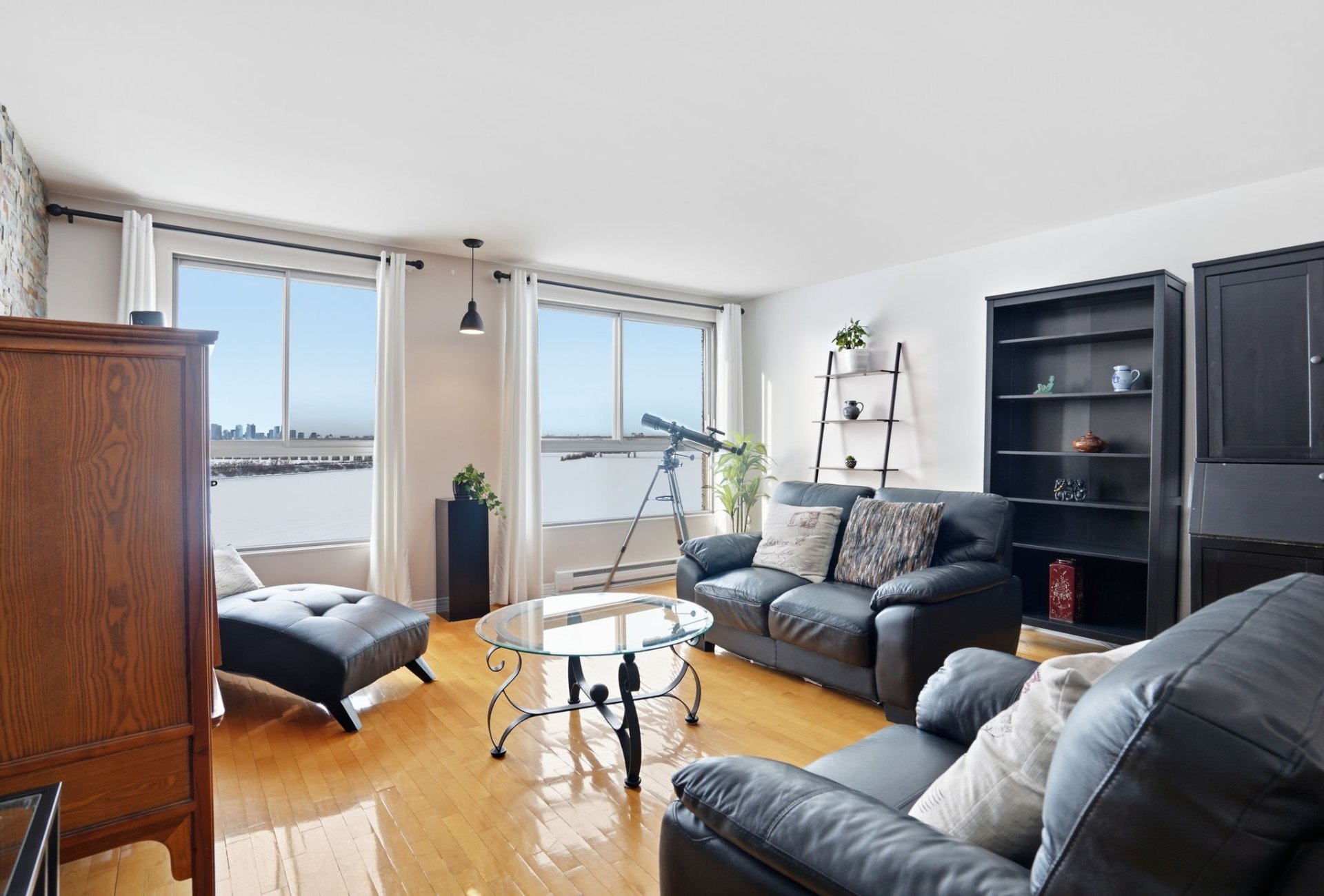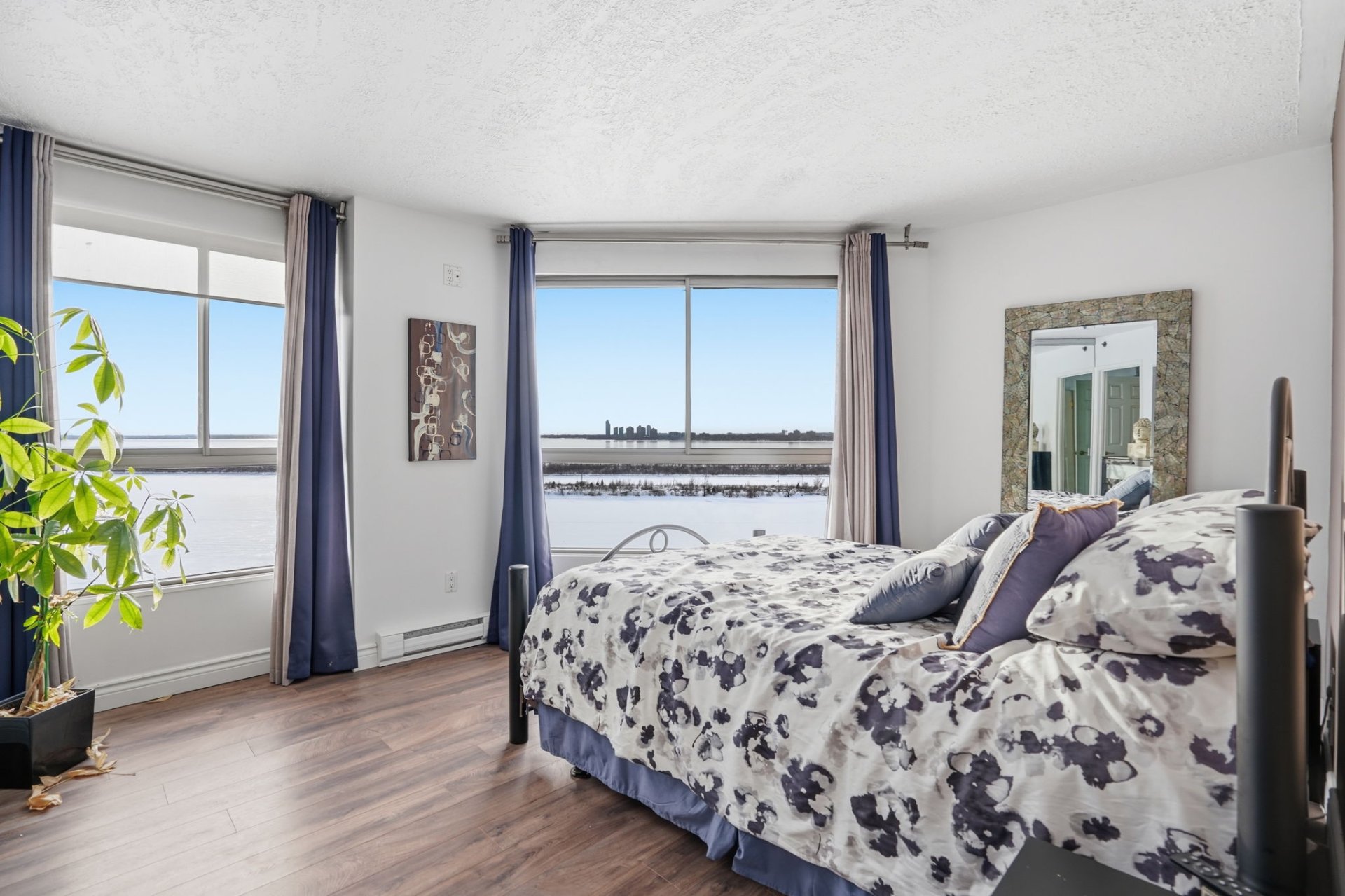 Spectacular view and exceptional location. On the 11th floor, this beautiful condo offers a breathtaking panorama of the St. Lawrence River, visible from both the living room and the bedroom. Originally, the condo had two bedrooms and has been converted into a spacious one-bedroom unit with a bright, well-proportioned living area. The unit includes two full bathrooms (one of which is an ensuite that was recently renovated), indoor parking, and a storage space. The building offers a pool, spa, sauna, elevators, and more–perfect for a lifestyle focused on comfort and relaxation.