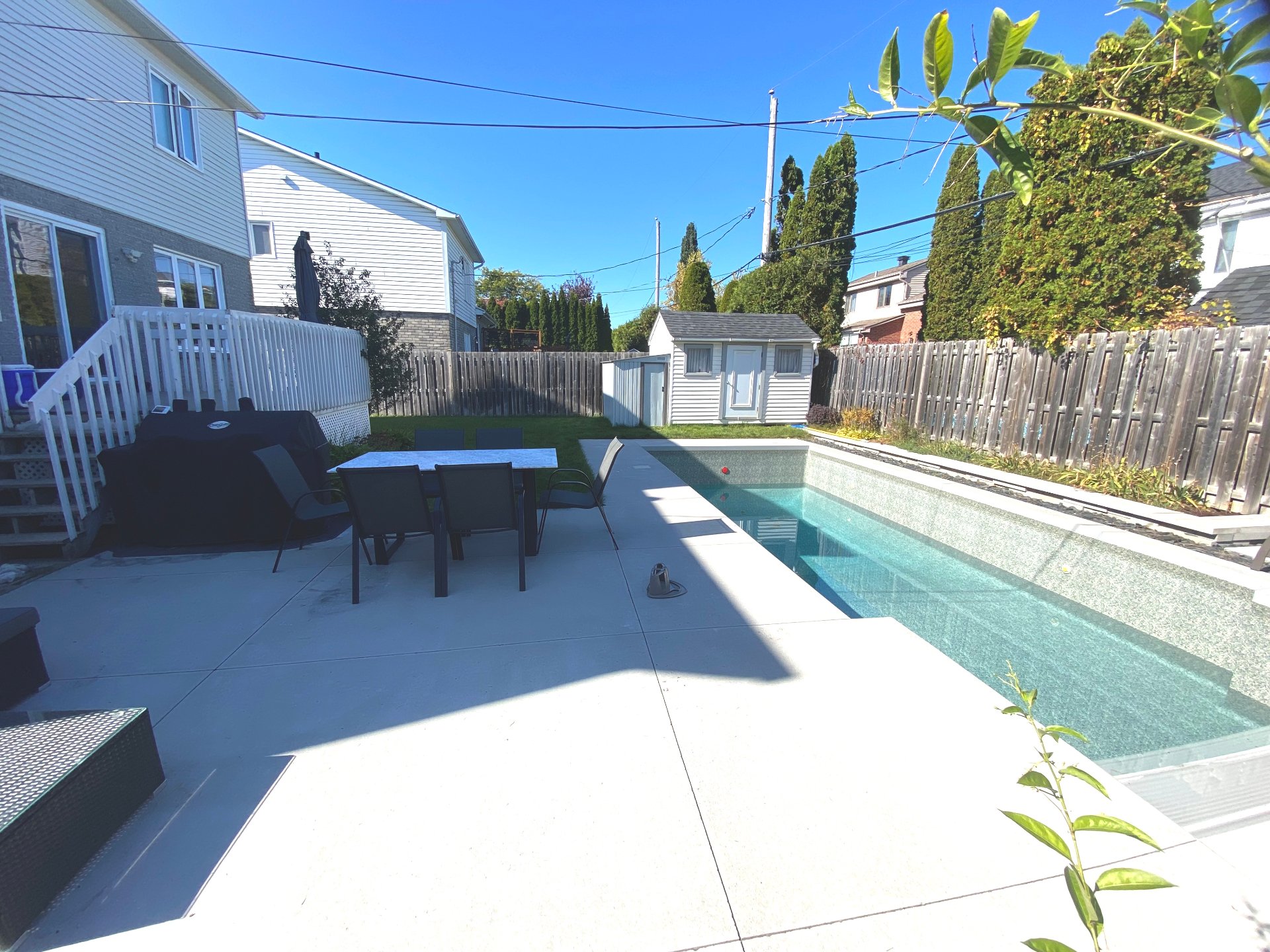 Beautiful mostly renovated turnkey property in Brossard. The main floor features heated porcelain flooring, a brand-new kitchen with a large central island and quartz countertops, a bathroom with shower, and a bright dining room open to the living area. Above the garage is a versatile space ideal for a home theater, office, or playroom. Upstairs: 3 bedrooms and a renovated ensuite bathroom. Finished basement with a 4th bedroom, large family room, and bathroom with washer and dryer. Backyard with in-ground pool. Strategic location near services and major highways, just steps from Dix30!