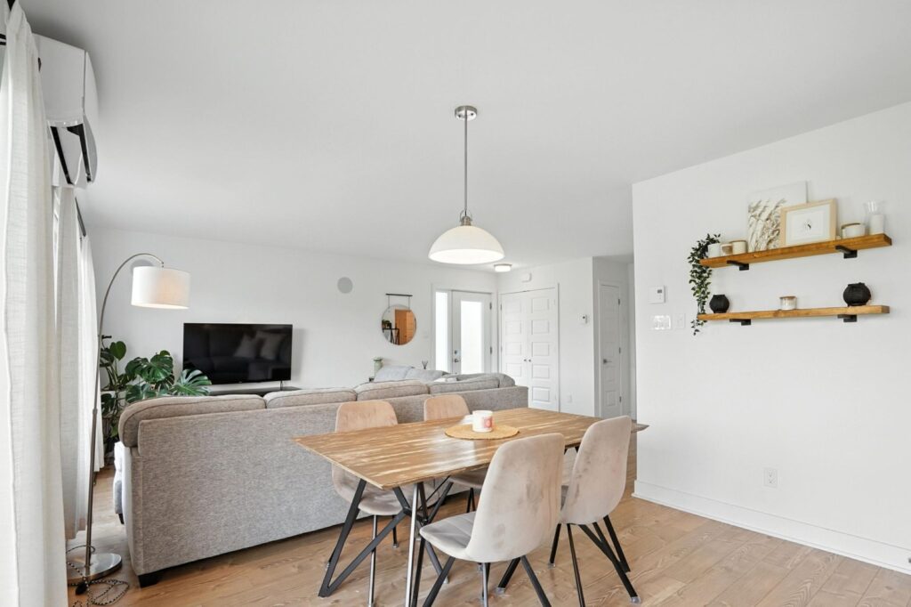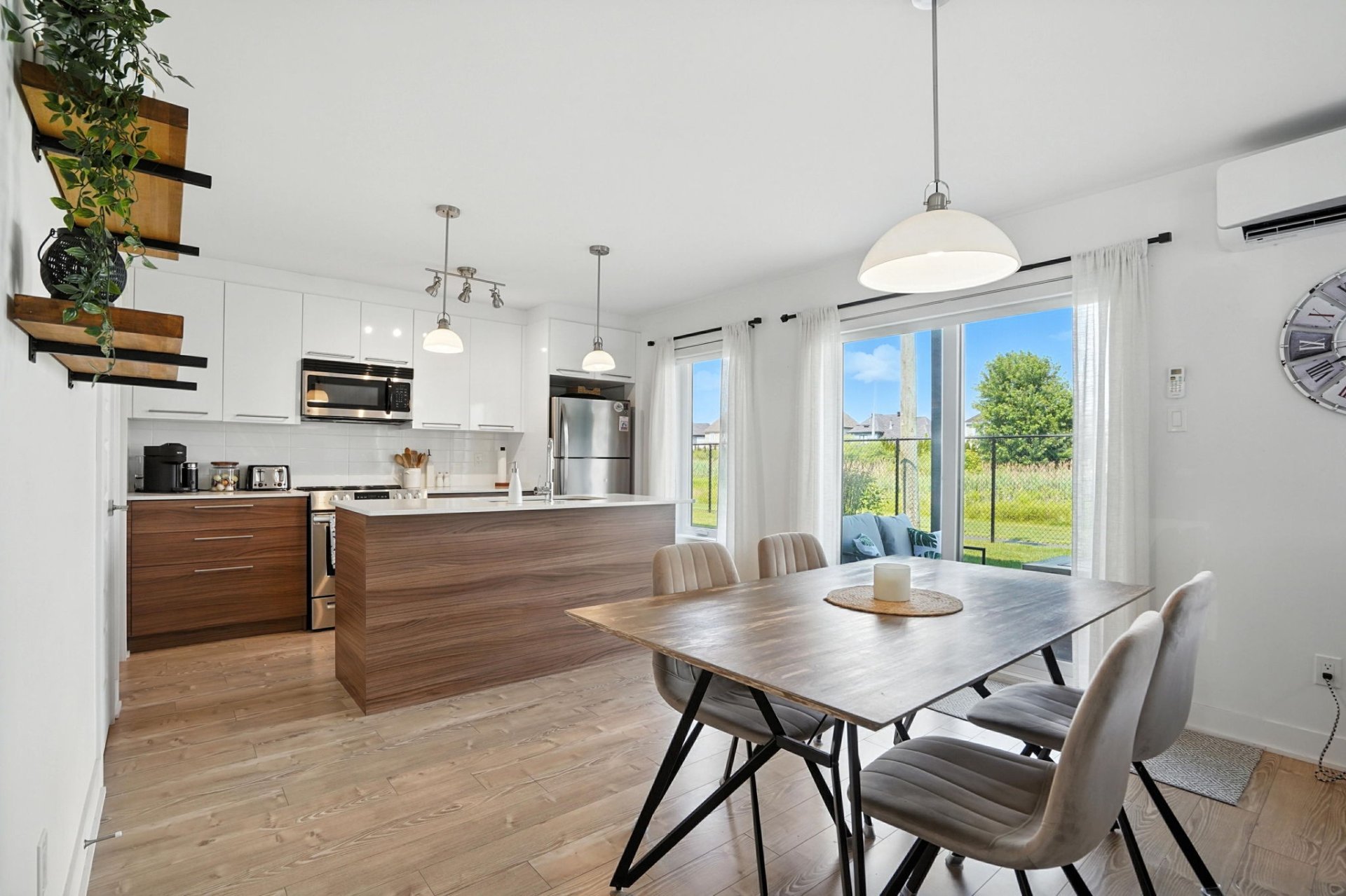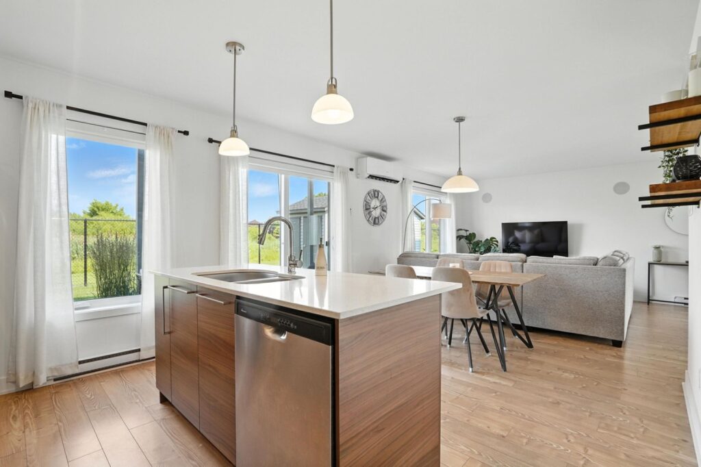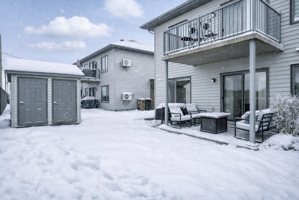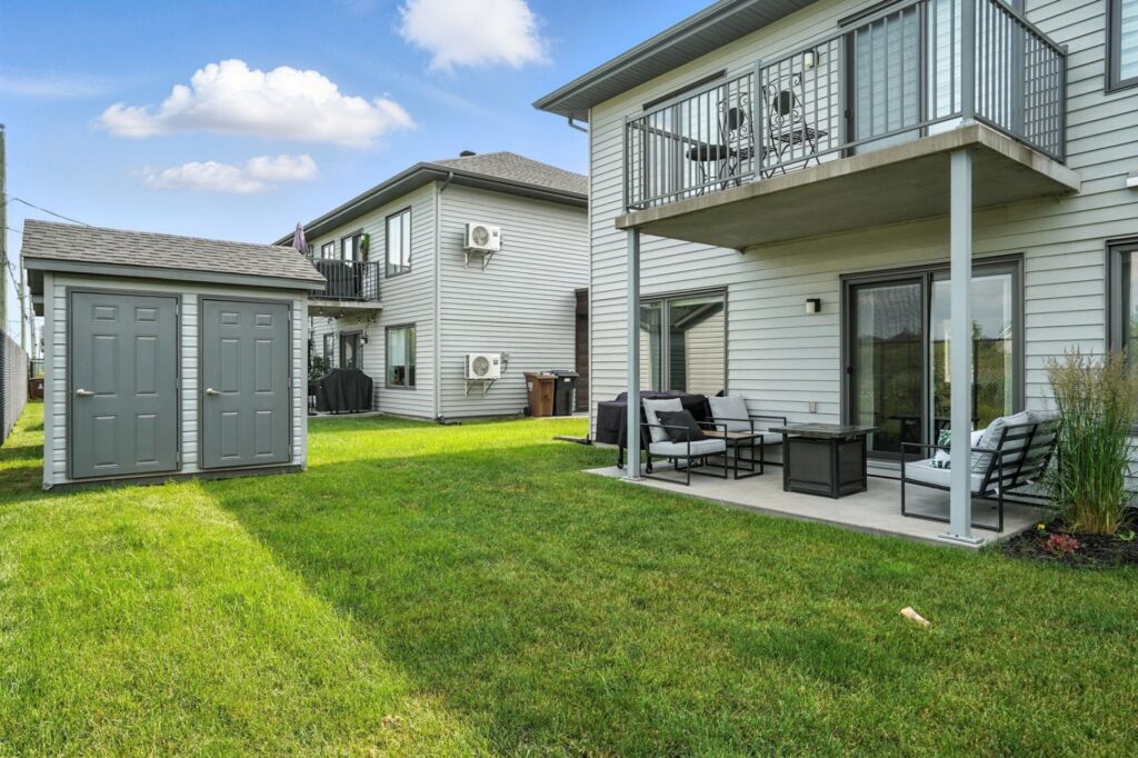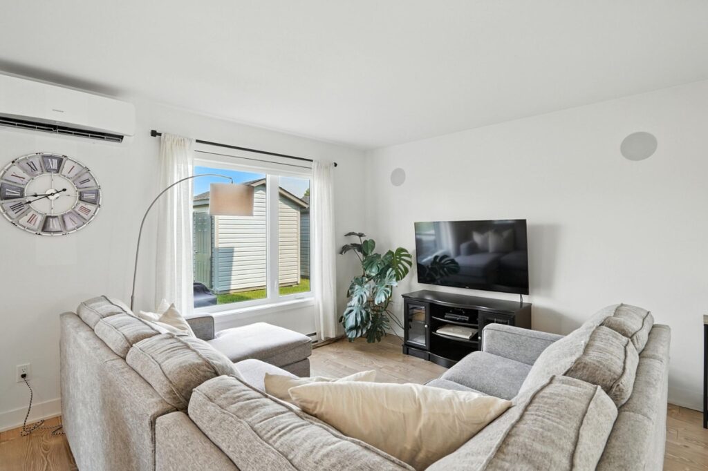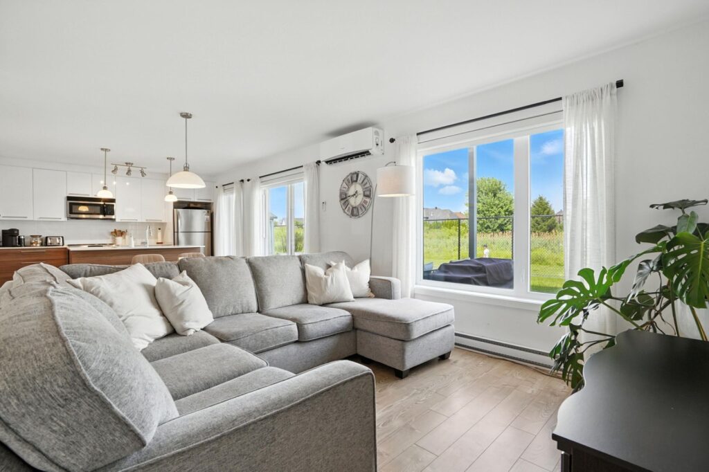 The condo is equipped with high-quality laminate flooring, melamine cabinets, included light fixtures, Sonos built-in speakers, an iPad with Sonos system, wall-mounted air conditioning, central vacuum, and an air exchanger for optimal comfort. The pre-wiring is ready for your televisions and telephones. Outside, you’ll enjoy a large concrete balcony, a grassy and paved yard, two parking spaces, and a practical shed. A turnkey concept combining contemporary style and premium amenities.