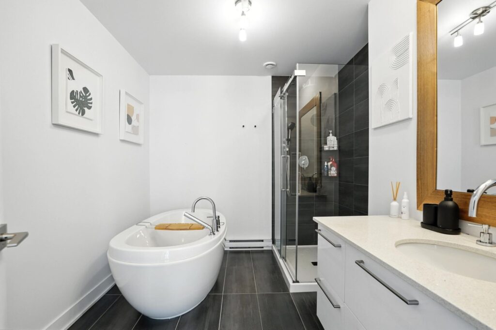 It offers you two spacious bedrooms and outstanding quality finishes. The modern kitchen impresses with its white ceramic backsplash, stainless steel microwave hood, and elegant quartz countertop. The bathroom features a freestanding bathtub and a ceramic shower with glass door and rain shower head, creating a spa-like atmosphere.