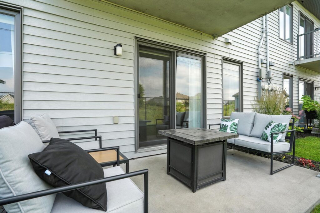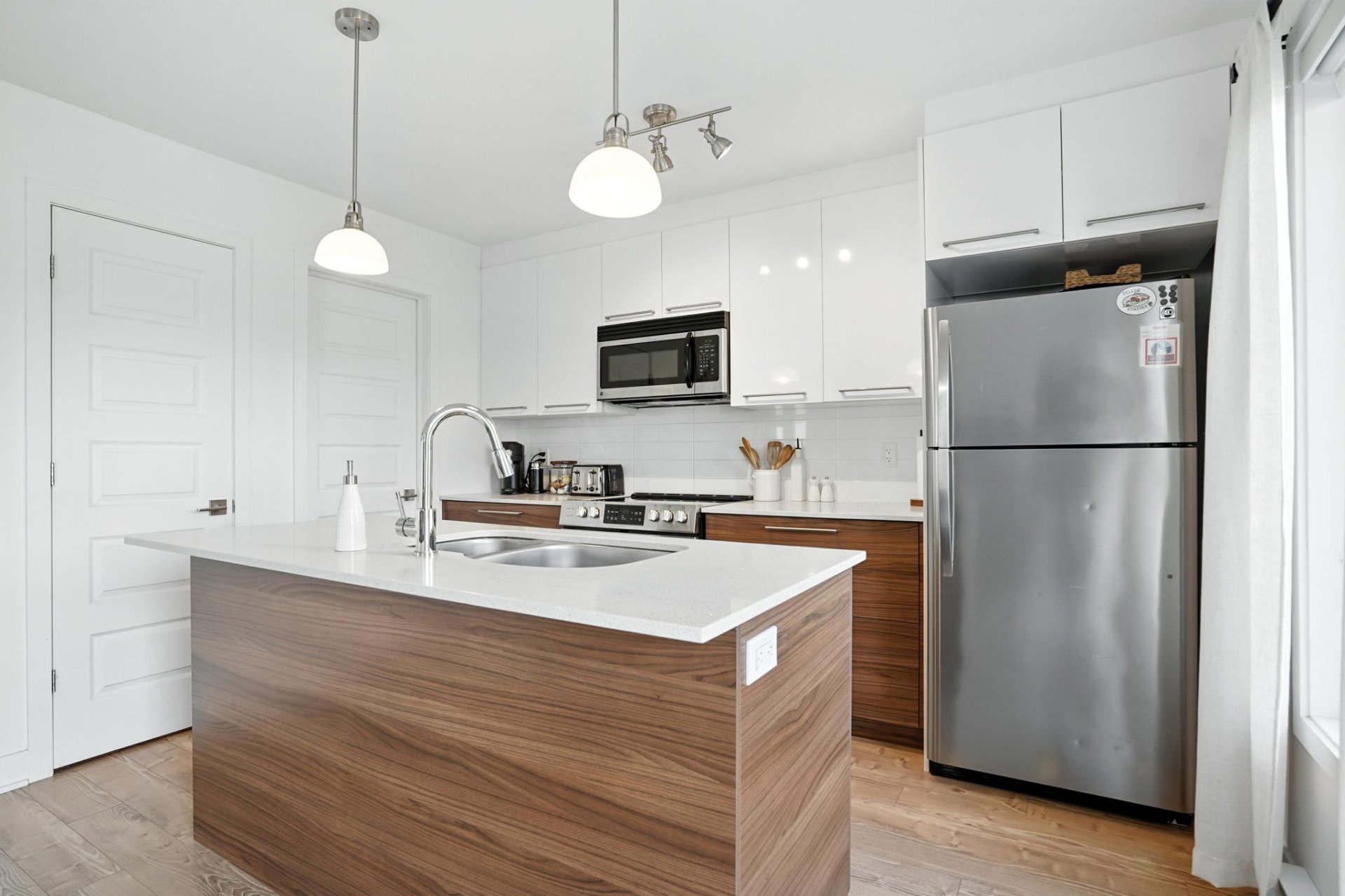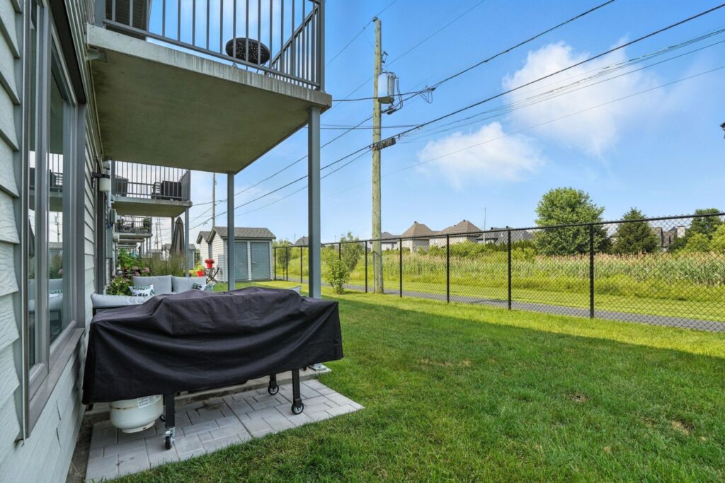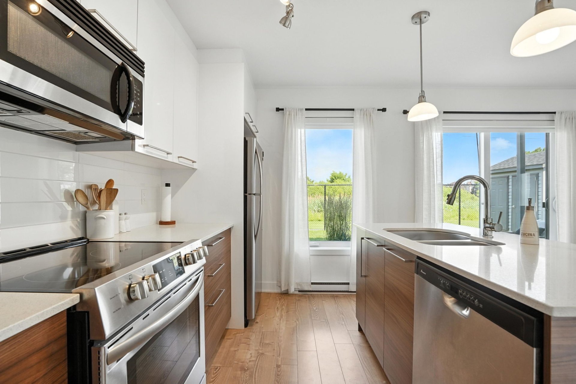 Discover this magnificent condo built in 2019, located on the ground floor of a peaceful and well-maintained building with no neighbors behind. It offers 2 good-sized bedrooms, one of which has a practical walk-in closet. The bright open-concept living area includes a welcoming living room, a dining area, and a functional kitchen with quartz countertops, perfect for entertaining. You will enjoy a beautiful private terrace, ideal for relaxing, as well as 2 storage spaces, both indoor and outdoor. Close to services, parks, schools, and main highways. Comfort and quality of life guaranteed!