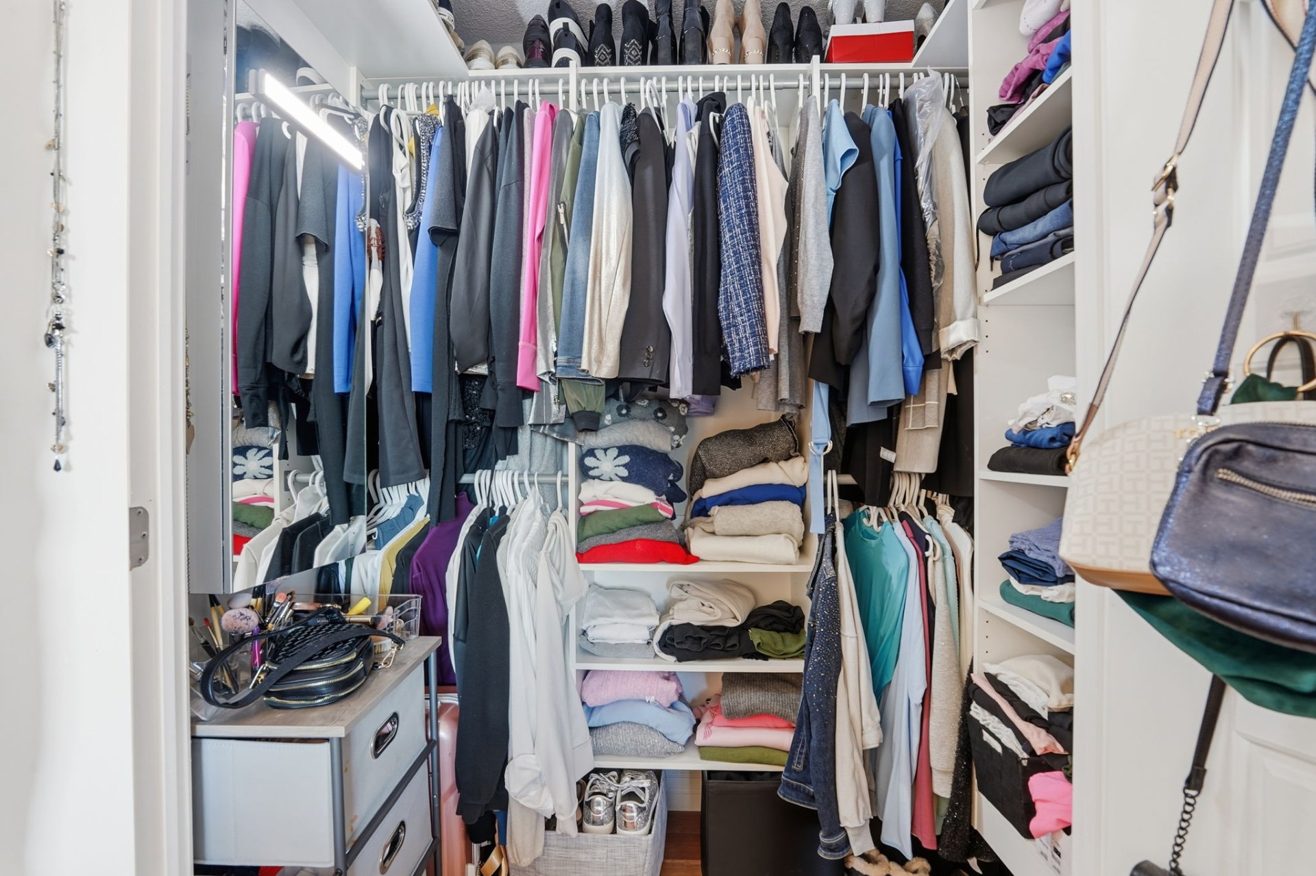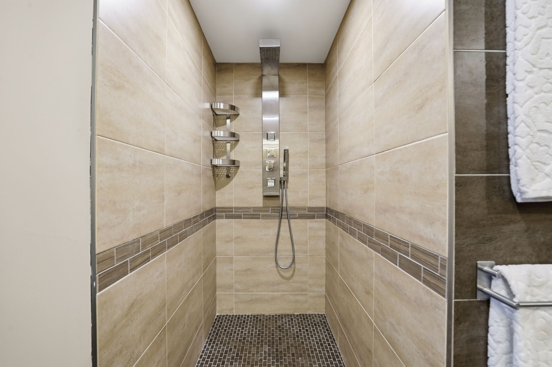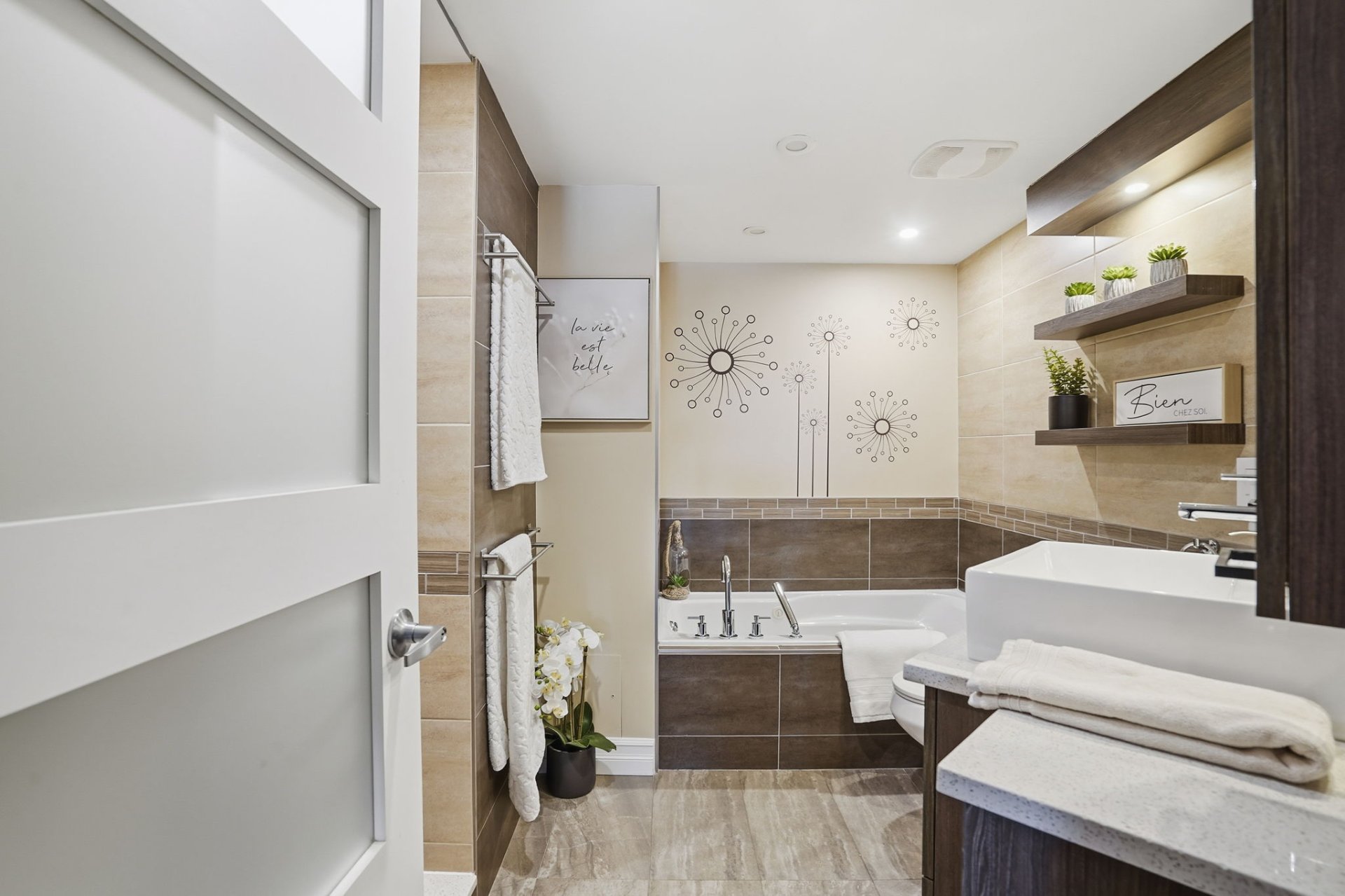 The private portion has benefited from numerous upgrades: replaced flooring, fully renovated kitchen and dining room, bathroom redone with heated floors, walk-in closet added to the primary bedroom, heat pump installed, hot water tank replaced, as well as replacement of the patio door and windows. The second bedroom has also been optimized with built-in storage and a decorative brick wall.