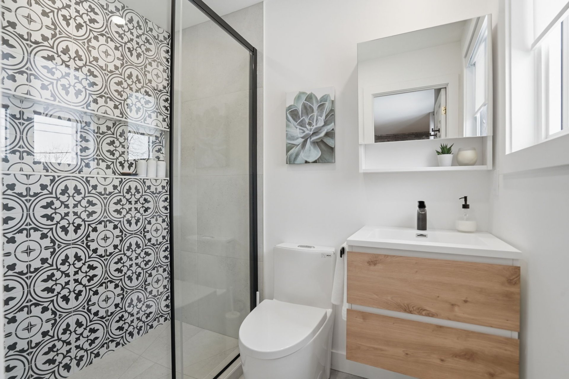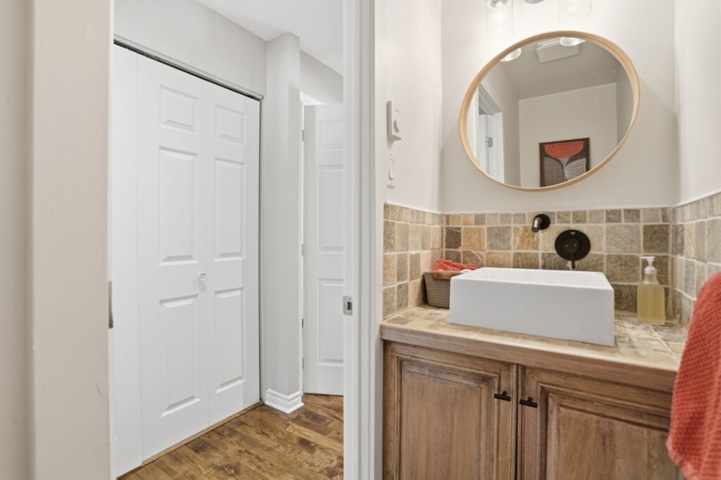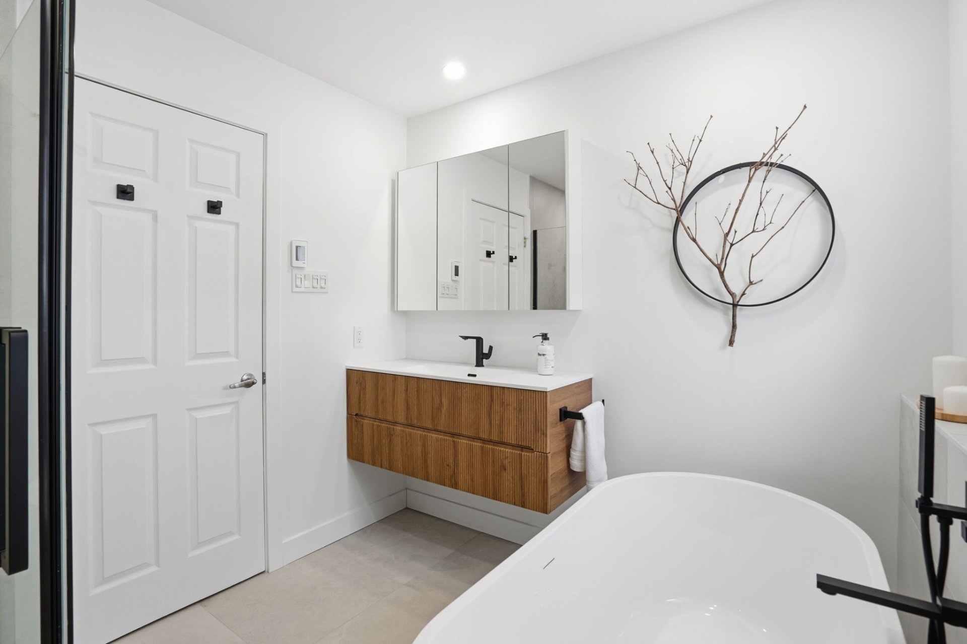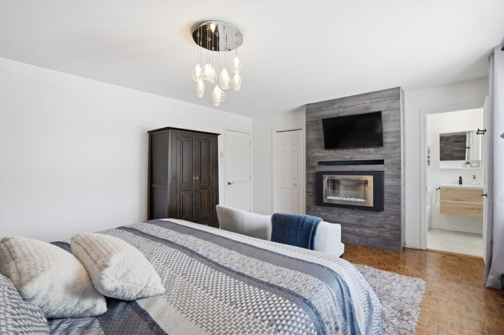 À l’étage, l’aire de repos comprend trois chambres bien proportionnées. La chambre principale bénéficie d’un foyer à l’éthanol ainsi que d’une salle de bains attenante rénovée en 2025, créant un véritable espace privé. Une seconde salle de bains complète à l’étage, également rénovée en 2025. Les chambres sont lumineuses et adaptées à une famille grandissante.